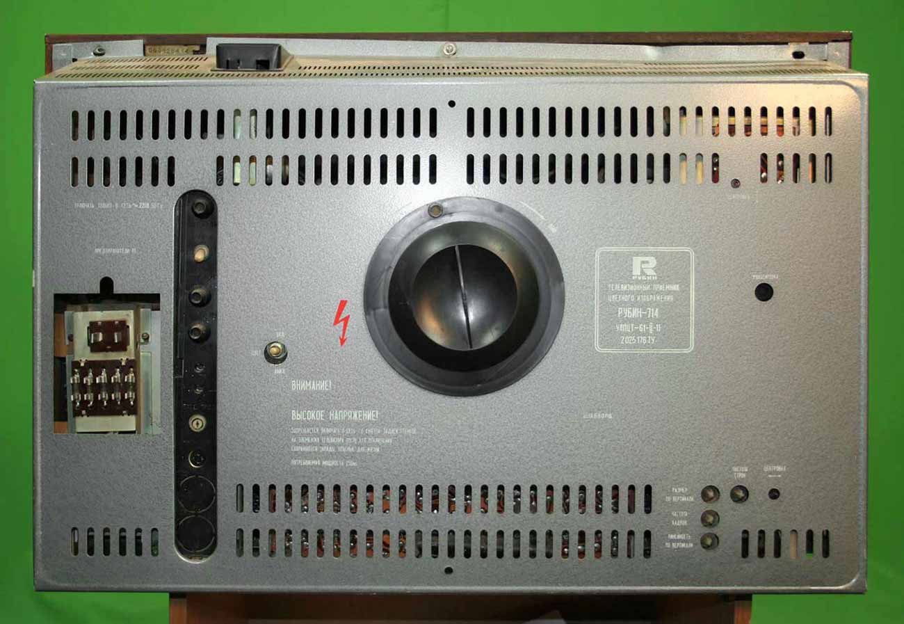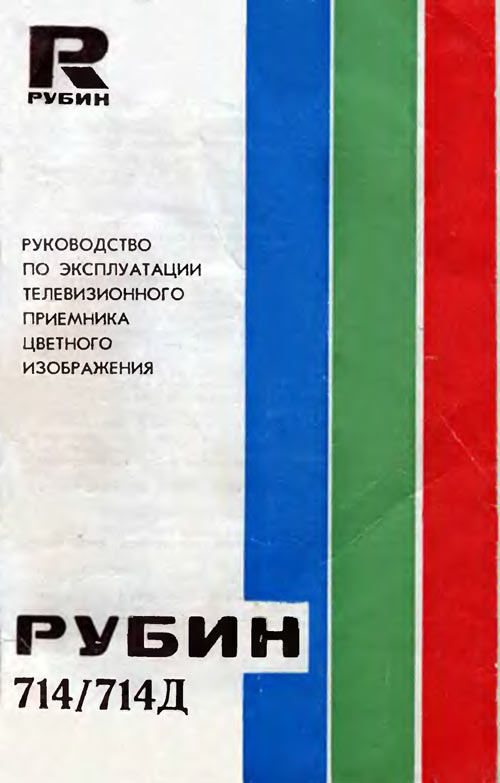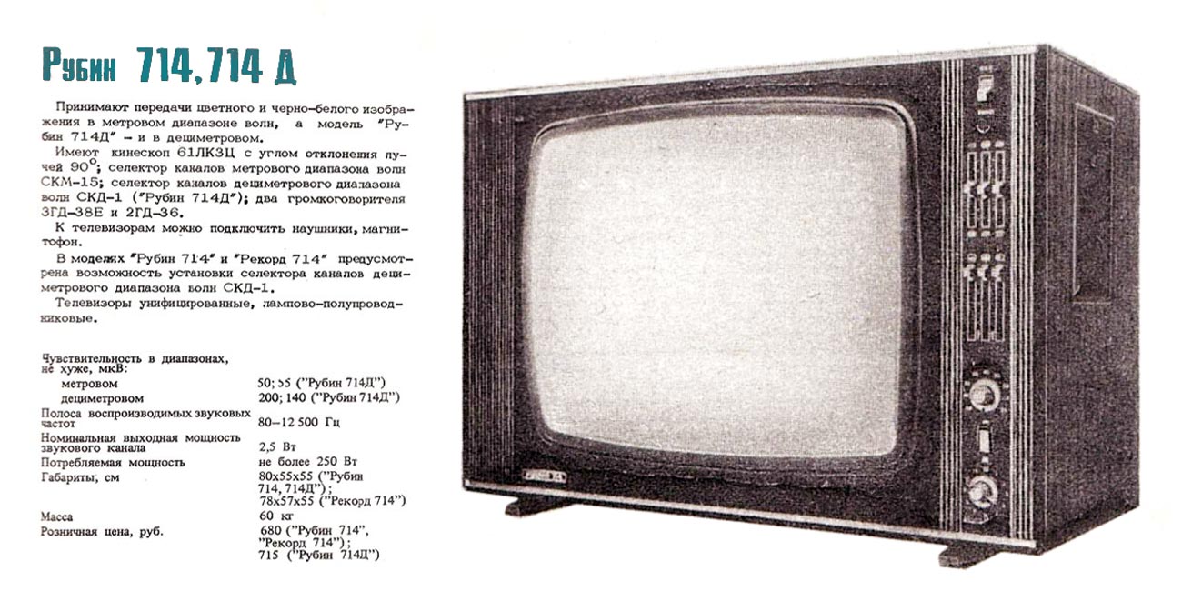Телевизионный приёмник цветного изображения *Рубин-714/Д* с 1976 года выпускало Московское ПО *Рубин*. Телевизор **Рубин-714/Д** стал долгожителем на конвейере. Выпуск был начат 10 января 1976 года, а законен 31 декабря 1985 года. *Рубин-714/Д* (УЛПЦТ-61II-11/10) унифицированный лампово-полупроводниковый телевизор для приёма телевизионных программ в цветном и ч/б изображении на любом из каналов в диапазонах МВ, а с индексом **Д** и в ДМВ. Размер изображения 362 х4 82 мм. Чувствительность в МВ диапазоне 50 мкВ, ДМВ 100 мкВ. Номинальная выходная мощность 2,3 Вт. Диапазон частот воспроизводимых АС, состоящей из 2-х разно-полосных громкоговорителей 80...12500 Гц. Разрешающая способность 450 линий. Потребляемая мощность 250 Вт. Габариты ТВ - 550 х 545 х 796 мм, масса 60 кг. Цена 680 или 715 рублей с индексом. Разработчики модели: Б.И.Ананский, В.Л.Кузнецов, Ю.М.Фёдоров, В.Н.Стрелков. Произведено 1 миллион 443 тысячи телевизоров, в том числе в экспортном варианте (всегда с индексом *Д*) 172 тысячи телевизоров.