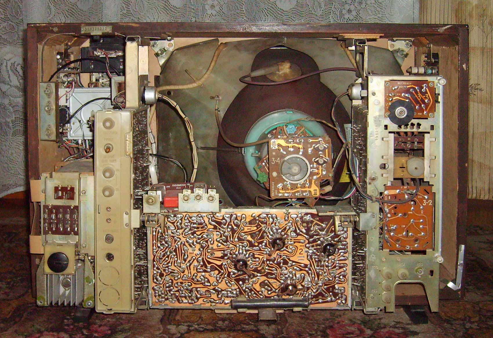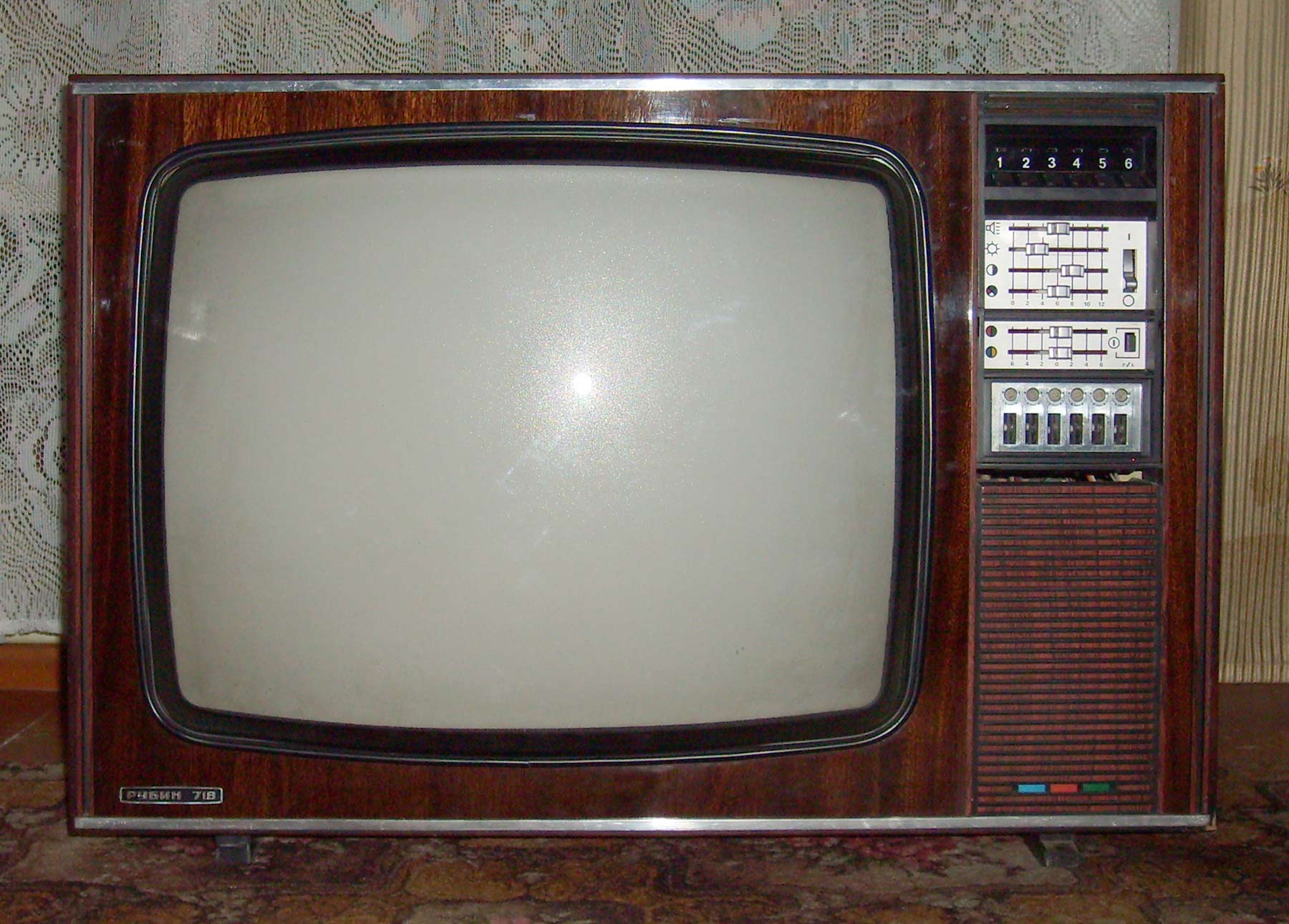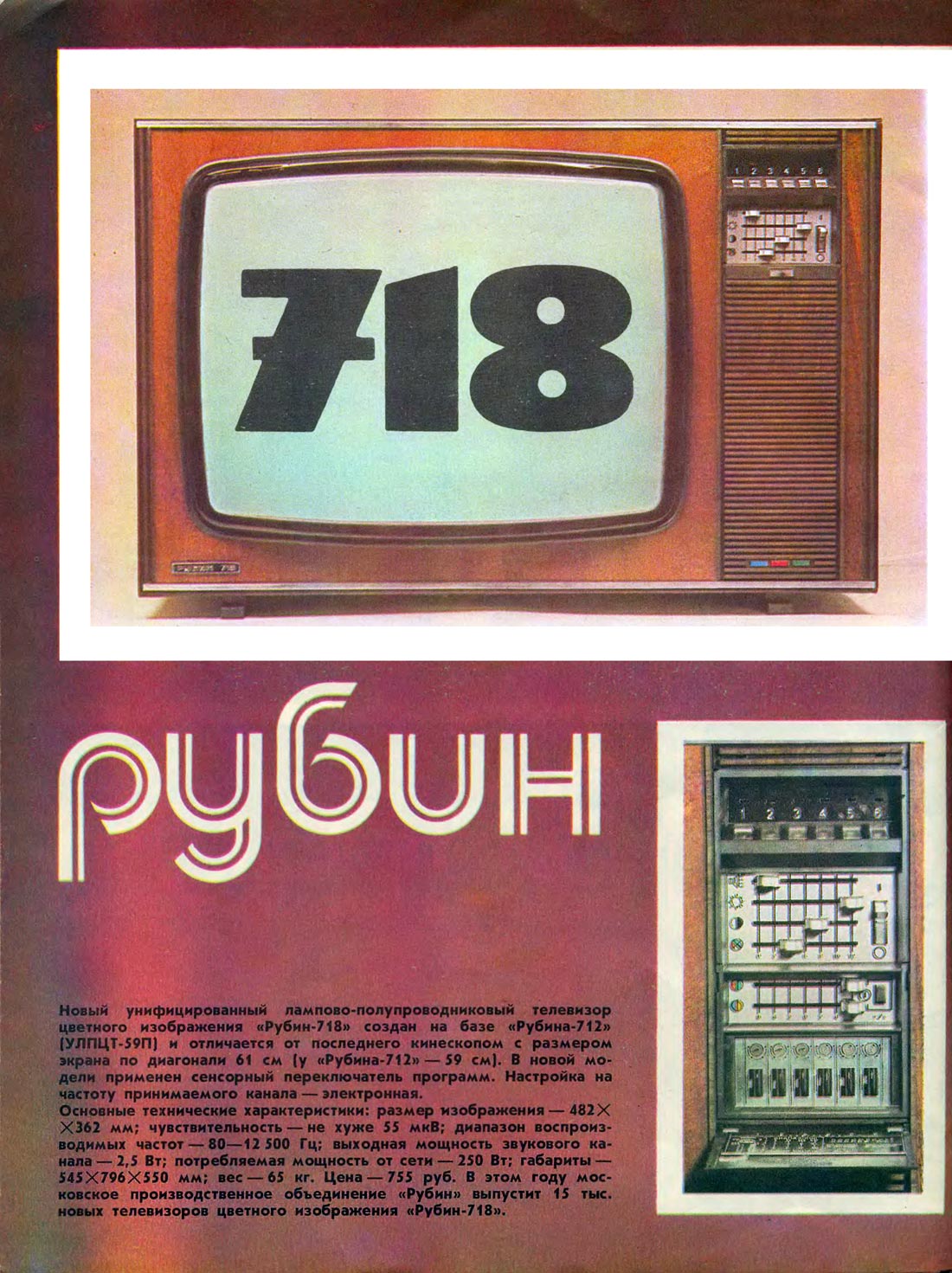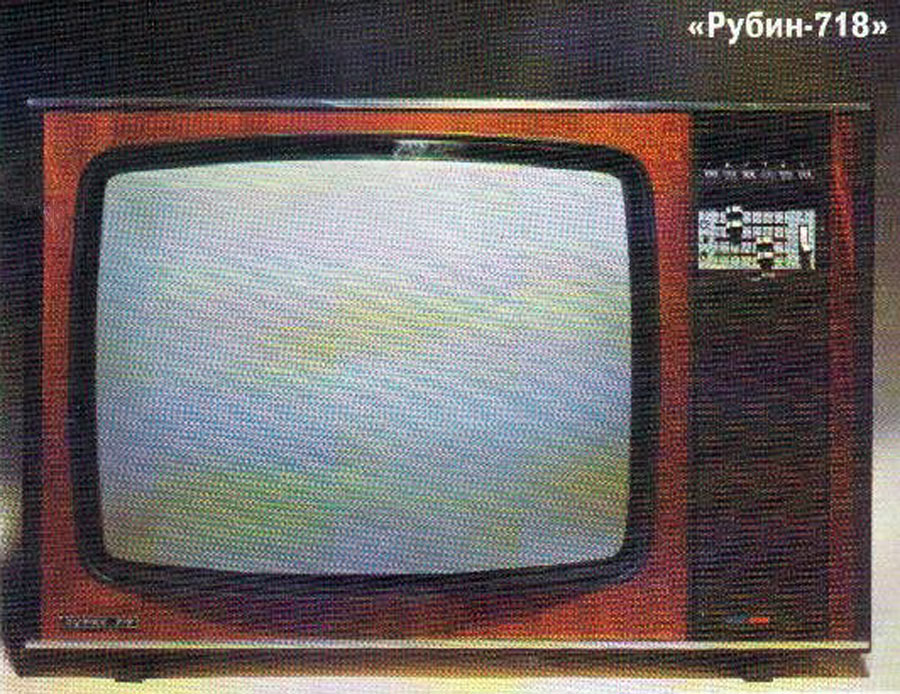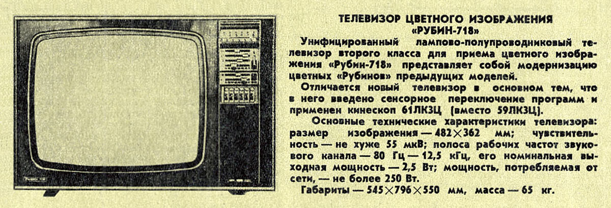 Цветной телевизионный приёмник *Рубин-718* с 1977 года выпускало Московское ПО *Рубин*. Цветной унифицированный лампово-полупроводниковый телевизионный приёмник второго класса **Рубин-718** представляет собой модернизацию телевизора **Рубин-712** и отличается сенсорным переключением программ и применением кинескопа 61ЛКЗЦ, вместо 59ЛКЗЦ. Размер изображения 362x480 мм. Разрешающая способность 450 линий. Количество принимаемых каналов в диапазоне MB - 12, ДМВ - 39. Потребляемая мощность 250 Вт. Чувствительность модели в диапазоне MB - 80 мкВ, ДМВ - 300 мкВ. Выходная мощность канала звука 2,3 Вт. Масса телевизора 65 кг.