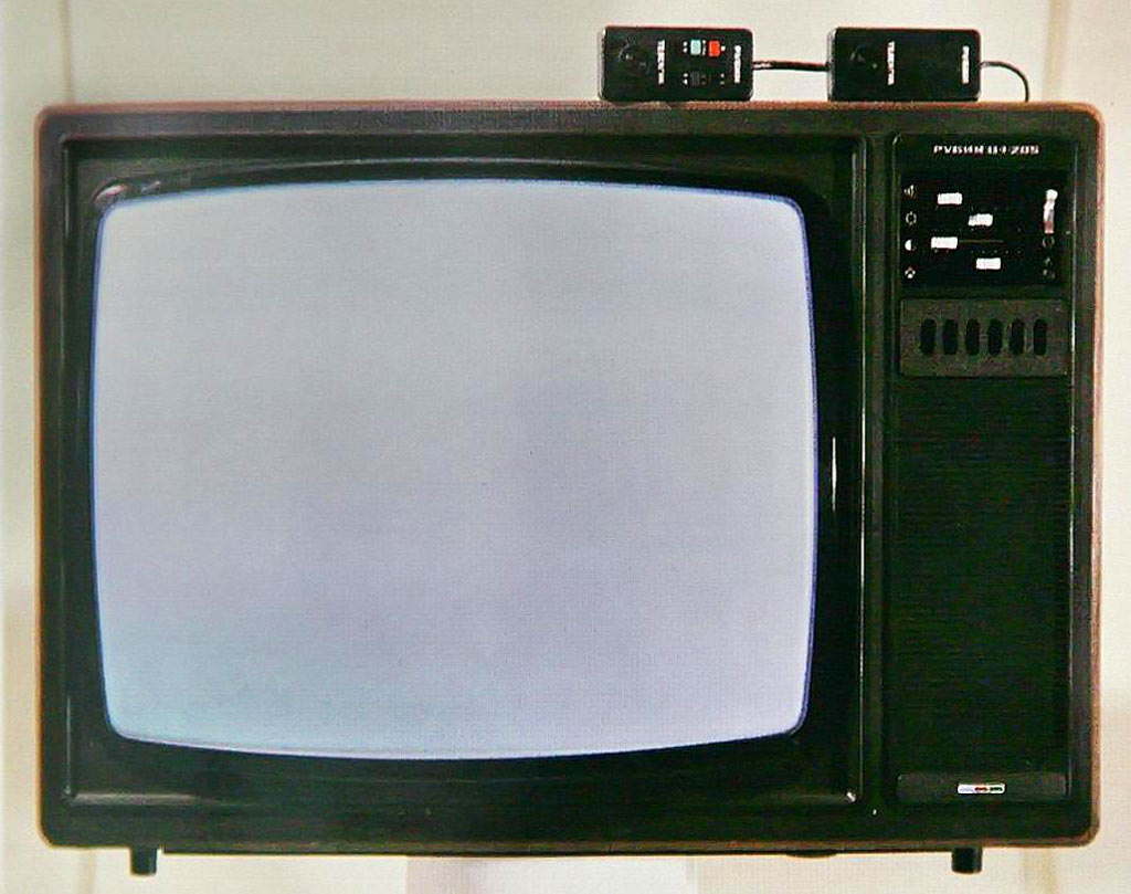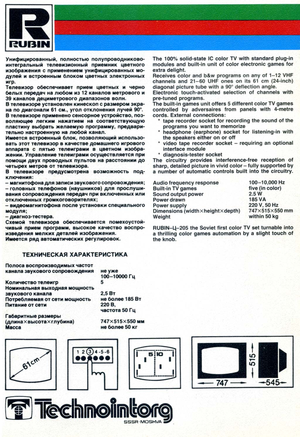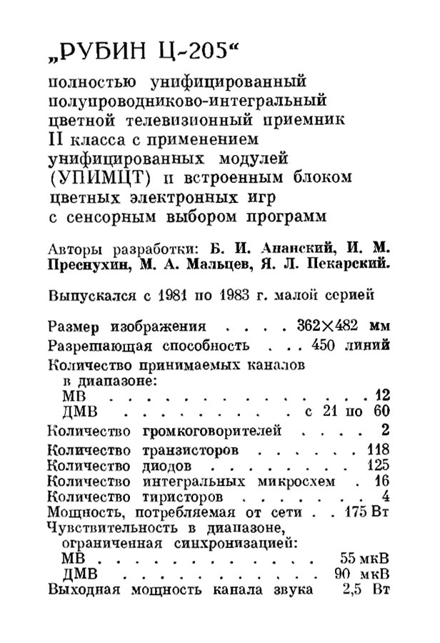 Телевизионный приёмник цветного изображения *Рубин Ц1-205* и *Рубин Ц-205* с 1981 года выпускало Московское ПО *Рубин*. **Рубин Ц1-205** - первая модель цветного телевизора на кинескопе с диагональю экрана 61 см со встроенным блоком цветных телевизионных игр. Телевизор выполнен на основе унифицированной модели УПИМЦТ-61-II. Выносные пульты телеигр подключаются к телевизору гибкими кабелями. Блок позволяет играть в 5 спортивных игр: тренировка, сквош, теннис, мини-футбол 1 или 2. Любая из игр сопровождается тремя разными звуками оповещающими о пропуске мяча, его ударе о границы поля или игрока. Можно так же изменить скорость мяча, размеры ракеток или игроков, угол отражения. Габариты телевизора 515х545х747 мм. Его масса 50 кг. Цена 850 рублей. Цветной телевизор **Рубин Ц-205** имеет такую же конструкцию и внешнее оформление, но без блока телевизионных игр. Его цена 775 рублей. Потребляемая мощность 175 Вт. Чувствительность в МВ 55, ДМВ 90 мкВ. Номинальная выходная мощность канала звука 2,5 Вт.