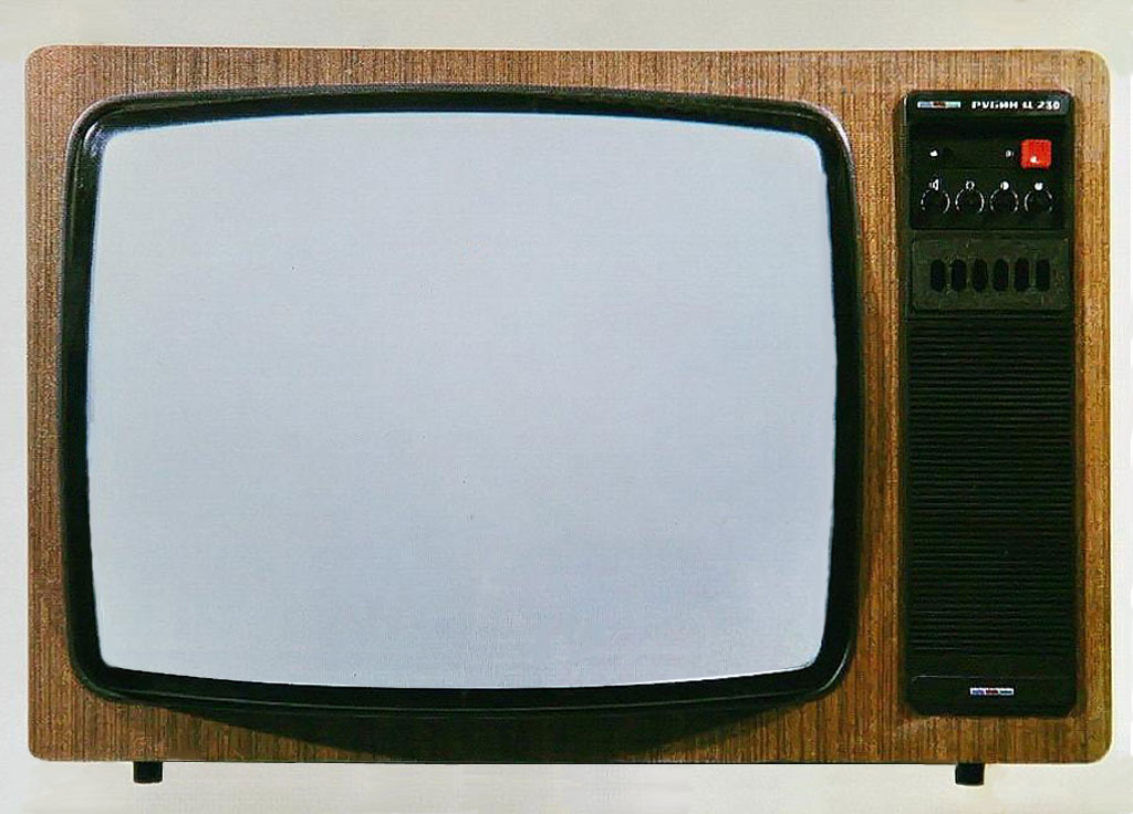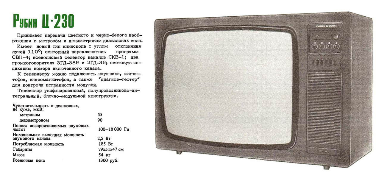 Телевизионный приёмник цветного изображения *Рубин Ц-230* с 1981 года выпускало Московское МПО *Рубин*. Унифицированный полупроводниково-интегральный цветной телевизор 2-го класса с применением унифицированных модулей *Рубин Ц-230* тип УПИМЦТ-67 работает в диапазонах МВ и ДМВ. Выбор любой из шести заранее настроенных программ сенсорный. Размер изображения 395 х 527 мм. Разрешающая способность 450 линий. Питание - сеть переменного тока 168...242 В. Потребляемая мощность 175 Вт. Чувствительность в МВ диапазоне - 50 мкВ, в ДМВ диапазоне - 90 мкВ. Номинальная выходная мощность канала звука 2,5 Вт. Диапазон воспроизводимых частот 100...10000 Гц. Габариты ТВ 790 х 510 х 470 мм. Масса 54 кг.