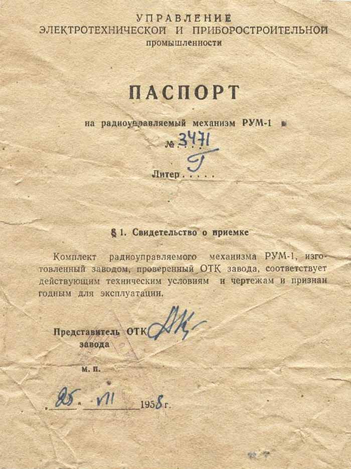 Шестиканальная аппаратура радиоуправления моделями *РУМ-1* разработана в Центральной авиамодельной лаборатории ДОСААФ СССР и производилась промышленностью с 1956 по 1959 год. Комплект аппаратуры *РУМ-1* предназначен для управления по радио моделями самолетов, кораблей, автомобилей и других устройств. В комплект аппаратуры входит трёхламповый передатчик с антенной и источниками питания, выносной пульт управления, позволяющий оператору подавать ту или иную команду, трёхламповый приёмник с одним резонансным и шестью поляризованными реле, исполнительные механизмы (три комплекта). Аппаратура позволяет выполнять 6 поочередных команд в любой последовательности. Радиус действия аппаратуры для наземных и надводных моделей до 500 м, для летающих до 1500 м. В приёмнике предусмотрена возможность перестройки по частоте от 27,8 до 29,7 МГц. Питание осуществляется от батарей или через блок питания от сети переменного тока. Всего до 1959 года было выпущено 20.000 аппаратов *РУМ-1*.