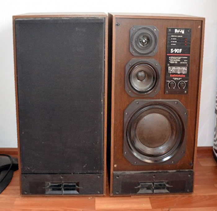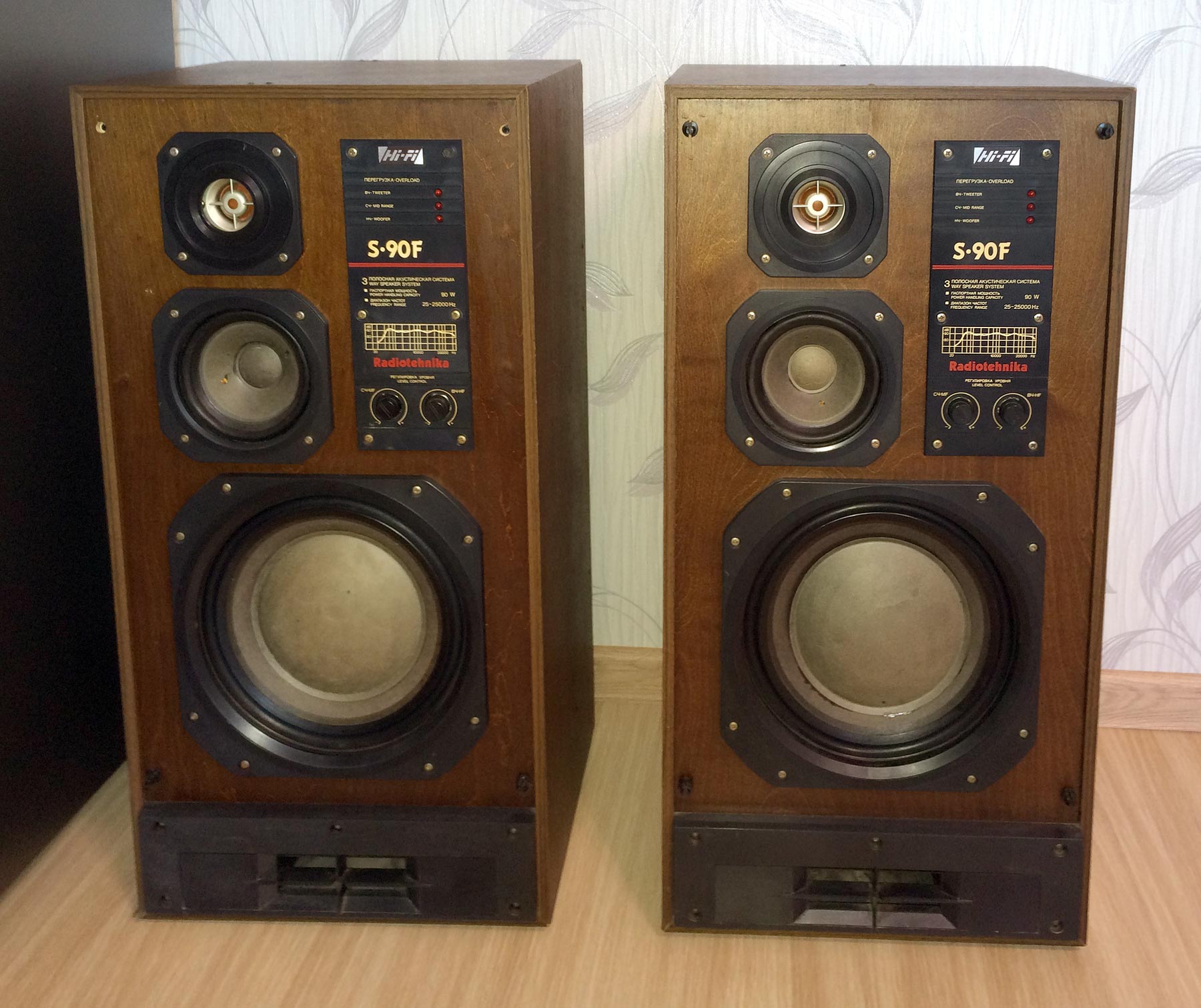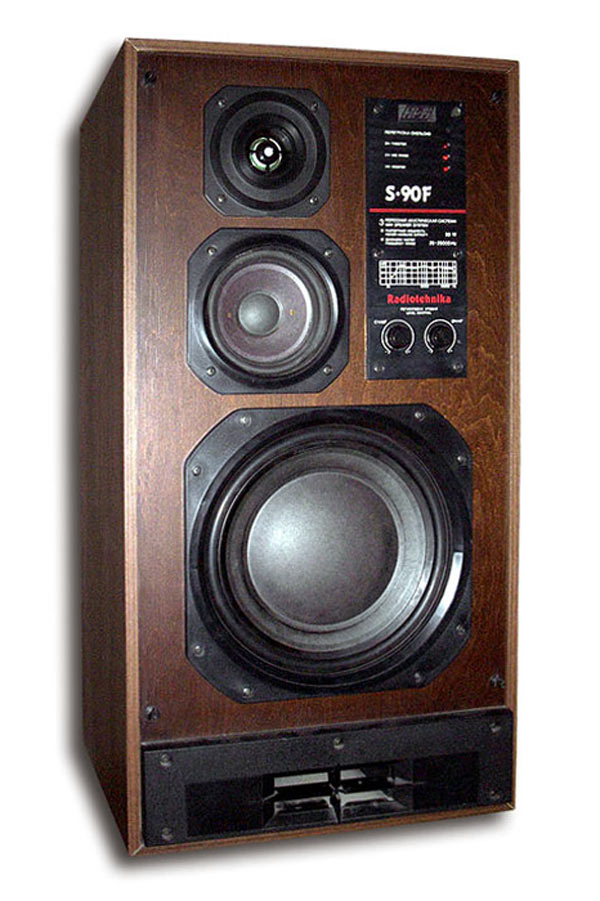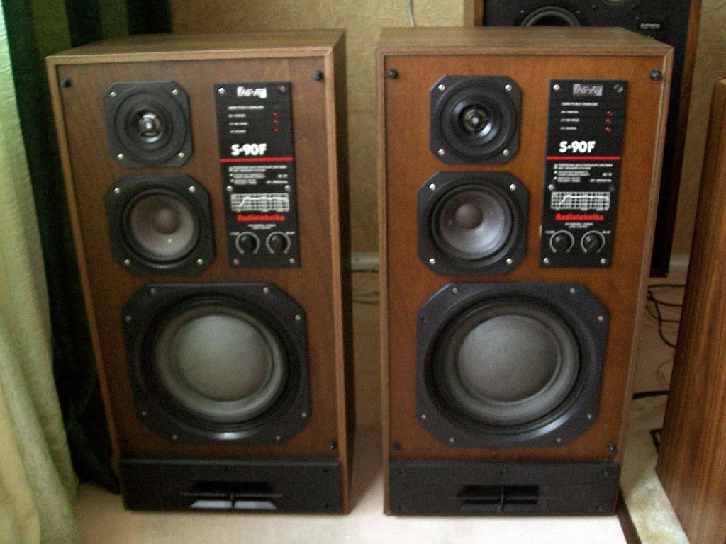 Трёхполосные акустические системы *S-90F* и *S-100F* выпускались с 1991 года Рижским радиозаводом им. А.С.Попова. АС предназначены для высококачественного воспроизведения звука в составе бытовой радиоэлектронной аппаратуры. В АС применены динамические головки прямого излучения: ВЧ 6ГДВ-6-25, НЧ 75ГДН-1-8. АС *S-90F* содержат среднечастотную головку 20ГДС-1-16, а *S-100F* - 30ГДС-3 с магнитной жидкостью MAXID, которая позволяет повысить мощность АС до 100 Вт. В АС имеются два плавных регулятора уровня воспроизведения для СЧ и ВЧ. Пределы регулировки от 0 до -6 дБ в диапазонах 500...5000 Гц и 5...20 кГц. В положении *-6 дБ* сигнал ослаблен в 2 раза. В АС имеется светодиодная индикация перегрузок громкоговорителей. Основные технические характеристики: Паспортная мощность 90 и 100 Вт соответственно. Номинальная электрическая мощность 35 Вт. Номинальное электрическое сопротивление 8 Ом. Диапазон воспроизводимых частот - 25...25000 Гц. Характеристическая чувствительность в диапазоне 100...8000 Гц при мощности 1 Вт не менее 89 дБ. Габаритные размеры любой АС - 710х360х285 мм, масса - 23 кг.