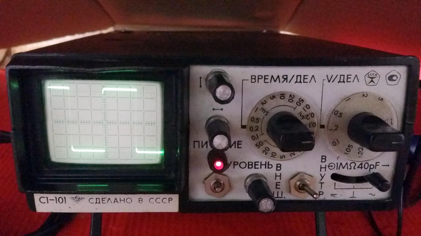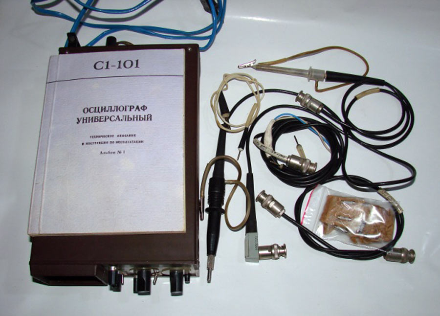 Миниатюрный универсальный осциллограф *С1-101* с 1987 года выпускало Львовское ПО им. Ленина и Екатеринбургское ООО *Белвар*. Прибор предназначен для исследования формы периодических электрических сигналов визуальным наблюдениям и измерениям амплитуд в диапазоне от 0,01 до 300 В и временных интервалов от 0,3* 10-6 с до 0,4 с. Диапазон: 0...5 МГц. Ширина луча ~ 0.6 мм. Размер экрана - 40x30 мм. Питание 220, 110, 27 и 12 вольт. Блок для питания осциллографа был как встренный внутрь, так и отдельный, вставляемый в специальную нишу прибора. Максимальное входное напряжение 300 В. Потребляемая мощность 18 Вт. Габариты прибора 281x155x69 мм. Вес 1.8 кг.