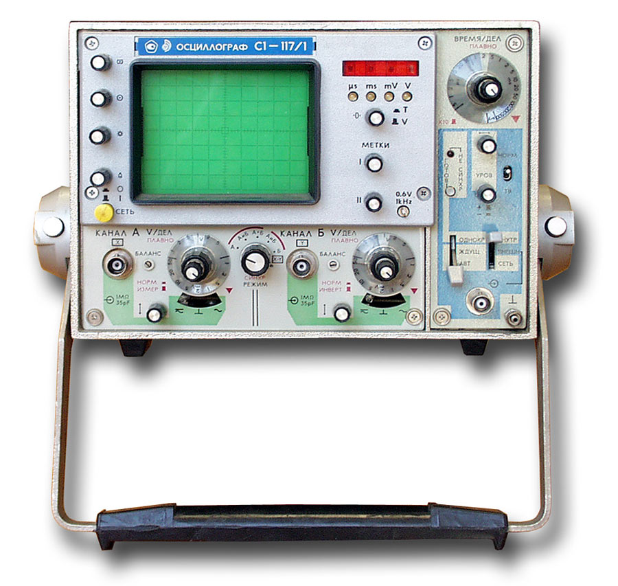 Осциллографы *С1-117/1* и *С1-117/2* с начала 1985 года выпускало Минское ПО *Калибр*. Универсальные двухканальные осциллографы **С1-117** предназначены для исследования формы электрических сигналов визуальным наблюдением и измерением амплитудных и временных параметров по ЭЛТ, а так же цифровым методом (для С1-117/1) с индикацией результатов измерения и размерности измеряемых параметров на светодиодном индикаторе. Оба осциллографа обеспечивают исследования сигналов в широком диапазоне амплитуд от 400 мкВ до 300 В с частотой до 15 МГц. Очень высокая чувствительность (0,1 мВ/дел.) позволяет использовать приборы в радиоизмерительной, вычислительной, электронной, медицинской технике, ядерной физике. Наличие ТВ синхронизации делает осциллограф удобным для ремонта телевизионных и видеоустройств.