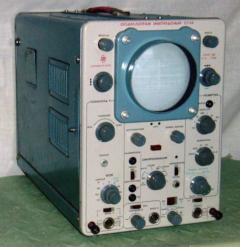 Осциллограф *С1-54* выпускался с 1970 года. Осциллограф *С1-54* - универсальный и предназначен для исследования импульсных и периодических процессов в лаборатории, полевых и высотных (до 5 км) условиях. Технические характеристики: Прибор позволяет наблюдать и измерять периодические и импульсные электрические сигналы: в диапазоне амплитуд от 0,01 В до 500 В; в диапазоне частот периодических сигналов от 2 Гц до 20 МГц; параметры импульсов длительностью от 0,1 мкс до 0,5 с с частотой следования от 200 Гц до 500 кГц; Неравномерность частотной характеристики усилителя вертикального отклонения не более 3 дБ в диапазоне частот от 0 до 20 МГц, не более 1 дБ в полосе частот 50 Гц-3 МГц для широкой полосы и не более 3 дБ в диапазоне частот от 2 Гц до 2 МГц для узкой полосы. Максимальная чувствительность усилителя горизонтального отклонения 0,05 мм/мВ. Неравномерность АЧХ усилителя горизонтального отклонения не более 3 дБ в диапазоне частот от 5 Гц до 2М Гц. Рабочая часть экрана 40х90 мм. Питание от сети переменного тока частотой 50 Гц, напряжением 220 В или 400Гц и 115 В. Мощность, потребляемая от сети 140 В•А. Масса прибора 25 кг. Габариты 260х380х550 мм. Наработка прибора на отказ 600 часов.