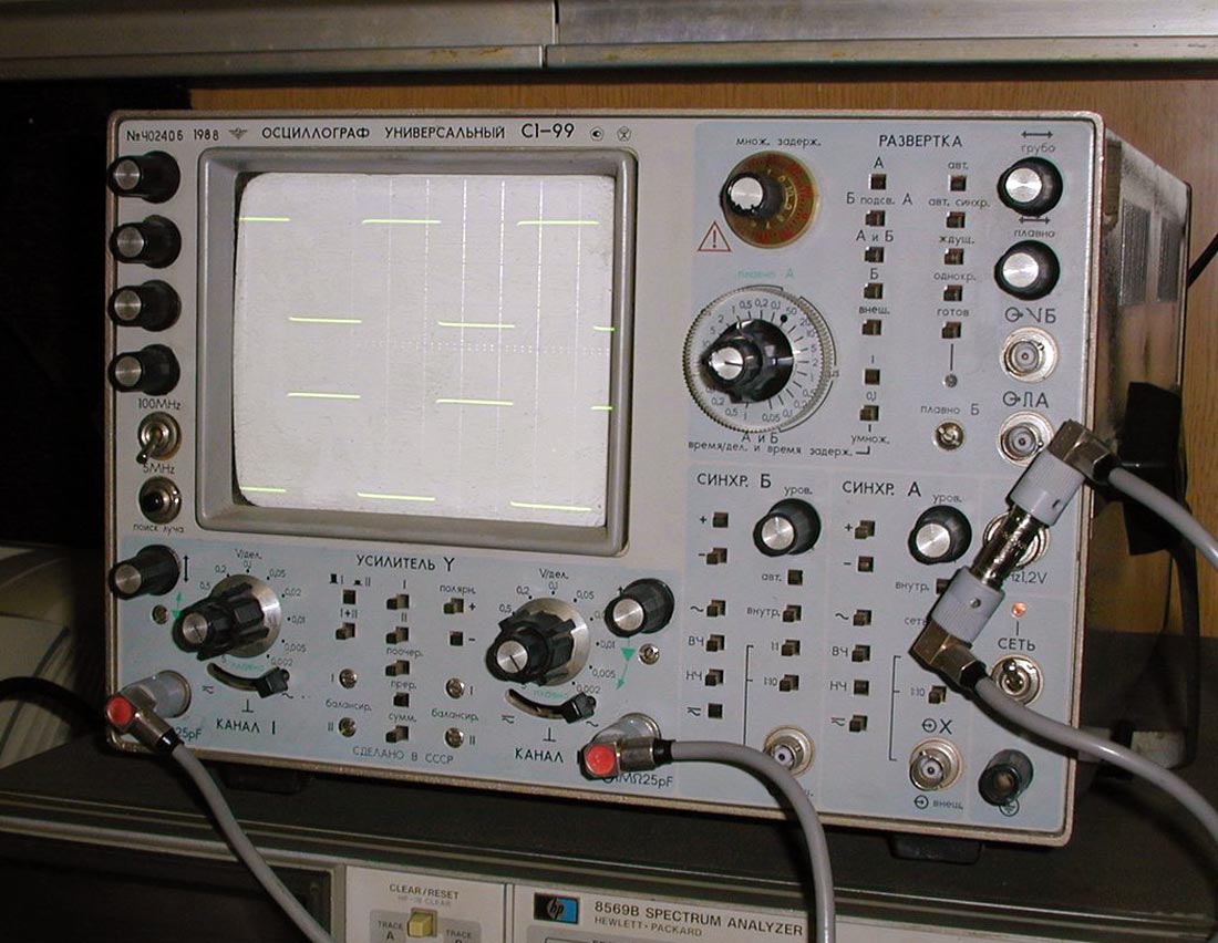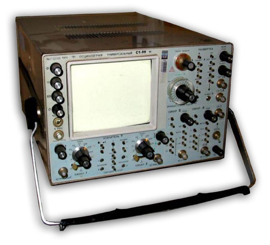 Универсальный осциллограф *С1-99* выпускался с 1987 года. Осциллограф универсальный **C1-99** предназначен для визуального исследования электрических сигналов в диапазоне частот постоянного тока до 100 Мгц путем измерения амплитуд и форм исследуемых сигналов в диапазоне напряжений от 0,008 до 40 В, а с выносным делителем 1:10 (И22.727.057) и до 200 В и временных интервалов в диапазоне от 2 * 10 (Е-8) B до 0,5 секунд; одновременного изображения двух сигналов на одной развертке а также исследования амплитуды и формы любой части сложного сигнала с помощью устройства задержанной развертки.