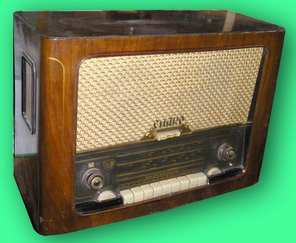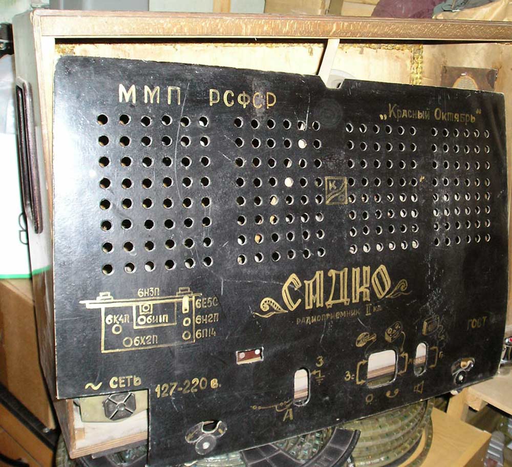 Радиоприёмник сетевой ламповый *Садко* с 1956 года выпускал Московский радиозавод *Красный Октябрь*. Сетевой ламповый приёмник **Садко** был разработан как перспективный для массового производства. Приёмник был в числе первых моделей, в которых применялись пальчиковые радиолампы. Радиоприёмник представляет собой семиламповый супергетеродин второго класса, работающий в диапазонах: ДВ - 2000...723 м, СВ - 577...187 м, КВ, двух поддиапазонах 76...39 м и 39...24,8 м и УКВ-ЧМ диапазоне 4,66...4,11 м. Радиоприёмник имеет раздельную регулировку тембра по НЧ и ВЧ, систему АРУ. УКВ-ЧМ радиостанции принимаются на внутреннюю дипольную антенну. В АС установлено четыре громкоговорителя; два широкополосных и два высокочастотных. Номинальная выходная мощность усилителя НЧ 2 Вт. Диапазон воспроизводимых звуковых частот при радиоприёме АМ радиостанций и нажатой клавише **МП** - 80...8000 Гц, при радиоприёме в УКВ-ЧМ диапазоне полоса звуковых частот 80...12000 Гц. Питается приёмник от электрической сети. Потребляемая мощность около 60 Вт. Габариты приёмника 615х340х290 мм, вес 18 кг. По неустановленным причинам было выпущено всего около одной тысячи приёмников.