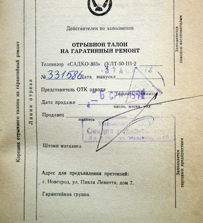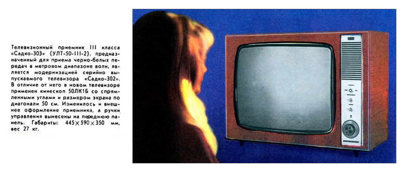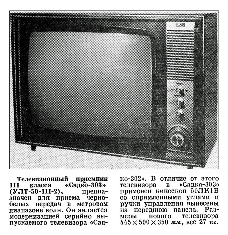 Телевизор **Садко-303** с 1972 года выпускал Новгородский телевизионный завод. Телевизор *Садко-303* (УЛТ-50-III-2) работает в любом из 12 каналов МВ диапазона. Печатные платы расположены на вертикальном штампованном шасси, что делает удобным доступ к лампам и элементам. Отдельно находится кинескоп 50ЛК1Б, с отклоняющей системой, блок ПТК и громкоговоритель 1ГД-36. Производился телевизор в настольном и напольном вариантах. Футляр прямоугольный, отделан ценными породами дерева. Сзади телевизор закрыт пластмассовой стенкой, с отверстиями для вентиляции. Основные ручки управления находятся на передней панели, это ручки ПТК, гетеродина, яркости, контрастности, громкости и выключатель сети. На заднюю стенку выведены гнёзда для подключения телефонов, ручки регулировки частоты кадров, размера по вертикали, частоты строк, линейности кадров, переключатель напряжения сети, предохранитель и антенные гнезда. К аппарату можно подключить магнитофон для записи или прослушивать звук на головные телефоны при отключенном громкоговорителе. Имеется ряд автоматических регулировок, которые позволяют вести устойчивый приём программ на удалении от телецентра. Уменьшение помех достигается применением АПЧ и Ф строчной развертки. Выходная мощность 0,5 Вт. Чувствительность 150 мкВ. Диапазон звуковых частот 125...7100 Гц. Питание от сети 127 или 220 В. Потребляемая мощность 160 Вт. Габариты телевизора 538 х 506 х 350 мм. Масса 30 кг.