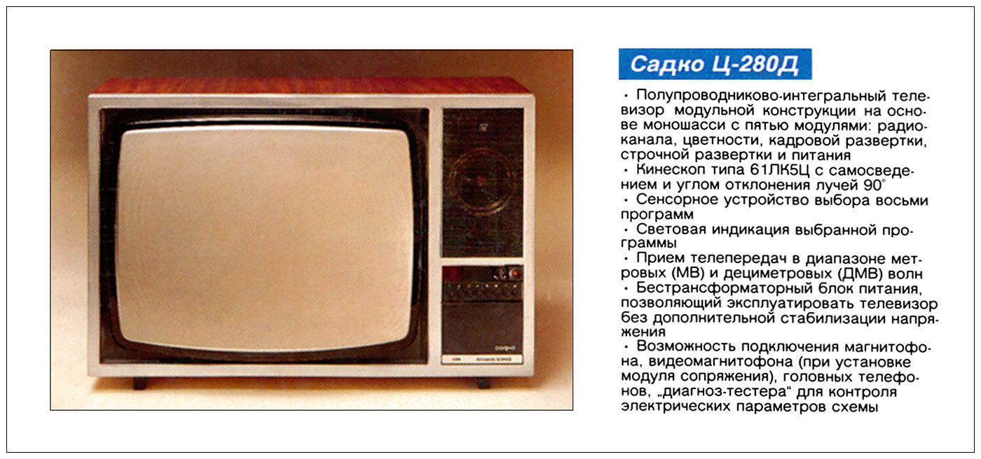 Телевизионный приёмник цветного изображения *Садко Ц-280Д* с I-кв 1985 года выпускал Новгородский завод *Квант*. Цветной унифицированный полупроводниково-интегральный цветной телевизор **Садко Ц-280Д** предназначен для приёма телевизионных программ в МВ и ДМВ диапазоне. В телевизоре имеется ряд автоматических регулировок обеспечивающих высококачественное изображение. Выбор 8 программ, осуществляется с помощью сенсорного переключателя. Отличительная особенность телевизора - применение импульсного источника питания и новой элементной базы, позволившей уменьшить габариты модели, массу, потребляемую мощность, увеличить надежность. В модели применены цветной масочный кинескоп 61ЛК5Ц с углом отклонения лучей 90° с самосведением, сенсорный переключатель программ УСУ-1-15, селектор каналов МВ диапазона СК-М-24, селектор каналов ДМВ диапазона СК-Д-24, цифровая индикация номера рабочего канала. Есть возможность подключения магнитофона на запись звукового сопровождения телевизионных программ, видеомагнитофона, при установке модуля сопряжения, прослушивания звукового сопровождения на головные телефоны, а также включения **диагноз-тестера** для контроля неисправности модулей. Размер изображения 362х482 мм. Диапазон воспроизводимых частот 80...12.500 Гц. Чувствительность в диапазонах (не хуже), мкВ: метровом 55. дециметровом 90. Выходная номинальная мощность канала звукового сопровождения 2,5 Вт. Потребляемая мощность 80 Вт. Габариты модели - 500х745х530 мм. Масса 32 кг.