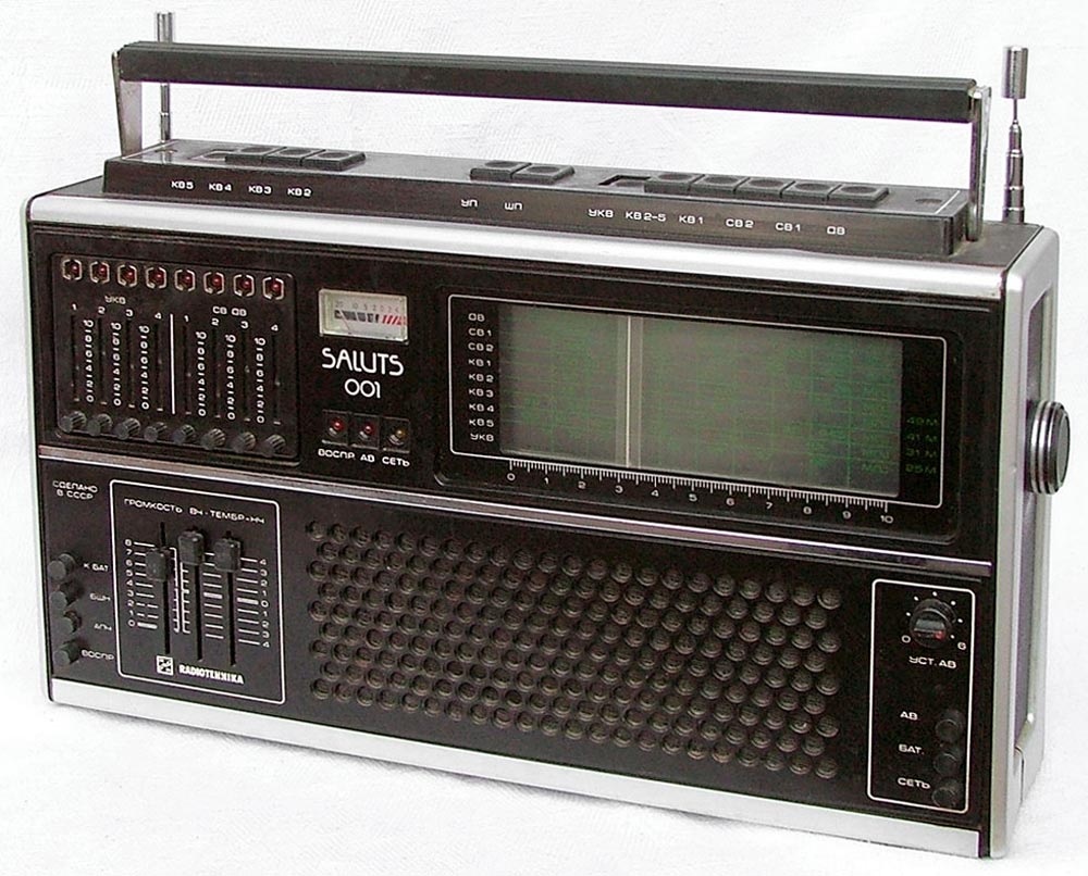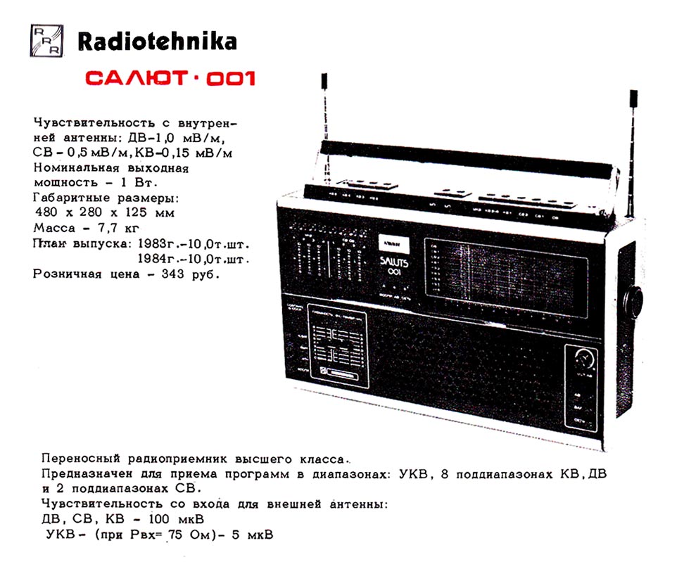 Переносной радиоприёмник *Салют-001* с 1980 года выпускал Рижский радиозавод имени А.С.Попова. Радиоприёмник высшего класса *Салют-001* создан специалистами КБ **Орбита** и предприятия **Штерн-радио** ещё в 1977 году. Приёмник отличается весьма высокими характеристиками, рядом потребительских качеств и не уступает лучшим мировым образцам. Электронная настройка и АПЧ во всех диапазонах, сенсорное переключение фиксированных настроек (а их 8, 4 в УКВ и 4 в остальных), возможность автовыключения приёмника по заданному времени, двойное преобразование частоты при приёме в диапазонах KB, многопетлевая система АРУ не полный перечень схемных особенностей применённых в приёмнике. Приёмник построен по функционально-блочному принципу. Блок ПЧ-ЧМ, блок регулирования громкости и тембра, кассета для убирающегося сетевого шнура разработаны немецкими специалистами, остальные и конструкция приёмника специалистами КБ **Орбита**. Экспортный вариант приёмника именовался **EuroMatic-001**, а ещё **Salute-001** и отличался другими частотами диапазонов КВ и УКВ.