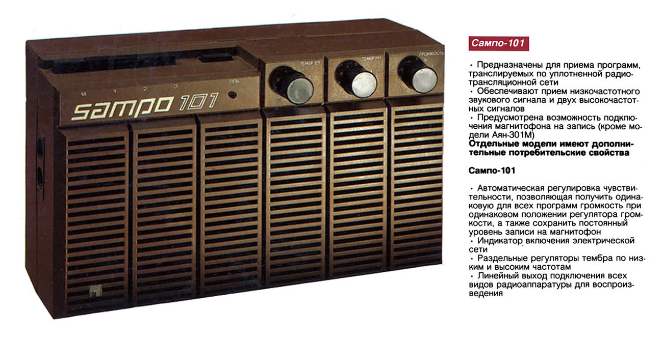 Приёмник трёхпрограммный *Сампо-101* выпускался с 1987 года Петрозаводским радиозаводом. Первый отечественный трёхпрограммный приёмник проводного вещания 1-й группы сложности **Сампо-101** предназначен для приёма программ транслируемых по уплотненной проводной трансляционной радиосети. Особенность ПТ - автоматическая регулировка чувствительности, которая позволяет получить одинаковую для всех программ громкость звучания при одном положении регулятора громкости, постоянный уровень записи на магнитофон независимо от уровней сигнала в каналах. ПТ имеет: регуляторы тембра по ВЧ и НЧ; индикатор включения сети; линейный выход сигнала. Корпус модели выполнен из цветного ударопрочного полистирола. Диапазон воспроизводимых частот 63...12500 Гц. Уровень звукового давления 75 дБ. Отношение сигнал/фон -53 дБ. Номинальная выходная мощность 0,5 Вт. Размеры ПТ - 277х174х101 мм. Масса - 1,8 кг.