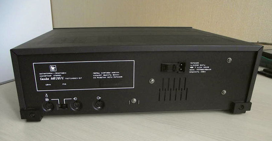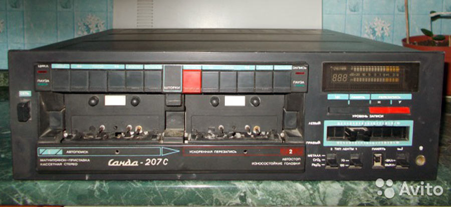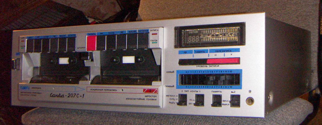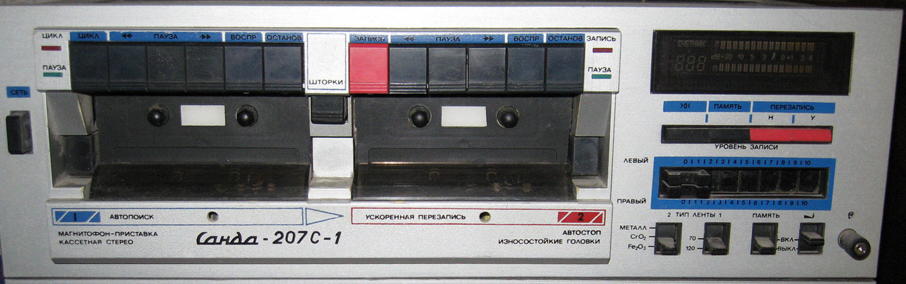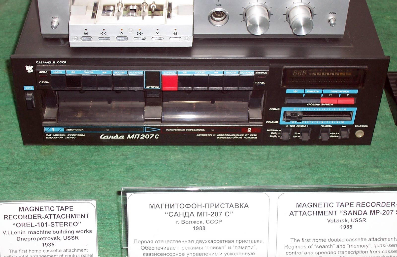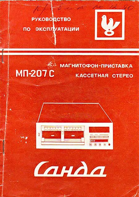 Магнитофон-приставка *Санда-207С* с 1988 года выпускалась Марийским машиностроительным заводом. С 1989 года наименование изменено на *Санда МП-207С*. МП является аналогом модели *Вильма-207С* и позволяет записывать фонограммы на магнитную ленту в кассетах МК, с их последующим воспроизведением на стереотелефоны или УКУ с АС. МП обеспечивает и перезапись фонограмм с кассеты на кассету. В состав МП входят два двух-двигательных ЛПМ с квазисенсорным управлением режимами работой электронной системой управления. Один ЛПМ работает в режиме воспроизведения, второй ЛПМ в режиме записи и воспроизведения. Перезапись фонограмм возможна с номинальной и удвоенной скоростями. В МП предусмотрены: переключение входов; световая индикация режимов работы; люминесцентная индикация уровней З/В; возможность работы с тремя типами лент; контроль расхода ленты по электронному счетчику; защита от недопустимых команд при случайном нажатии нескольких клавиш; автостоп при окончании ленты; выключения режимов при извлечении кассеты; ускоренный поиск фонограмм по паузам с автовключением на воспроизведение; последовательное воспроизведение двух кассет в режиме *Цикл*; режим *Память*; система шумоподавления; сендастовые головки. Диапазон частот, при использовании ленты с порошком хрома 40...16000 Гц. Уровень шума -55 дБ. Выходная мощность на стереотелефонах 2х5 мВт. Потребляемая от сети мощность 40 Вт. Габариты МП - 430х136х360 мм. Масса 7,9 кг. Магнитофон-приставка *Санда МП-207С-1* выпускаемая с 1991 года по своей конструкции, оформлению и параметрам схожа с базовой.