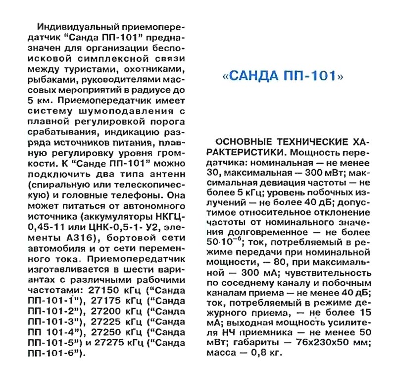 Одноканальный приёмо-передатчик *Санда ПП-101* с 1993 года выпускал Марийский машиностроительный завод. Вполне взрослая радиостанция. Выпускалась на одну из шести частот в диапазоне 27 МГц. Дальность связи между однотипными радиостанциями до 5 км.