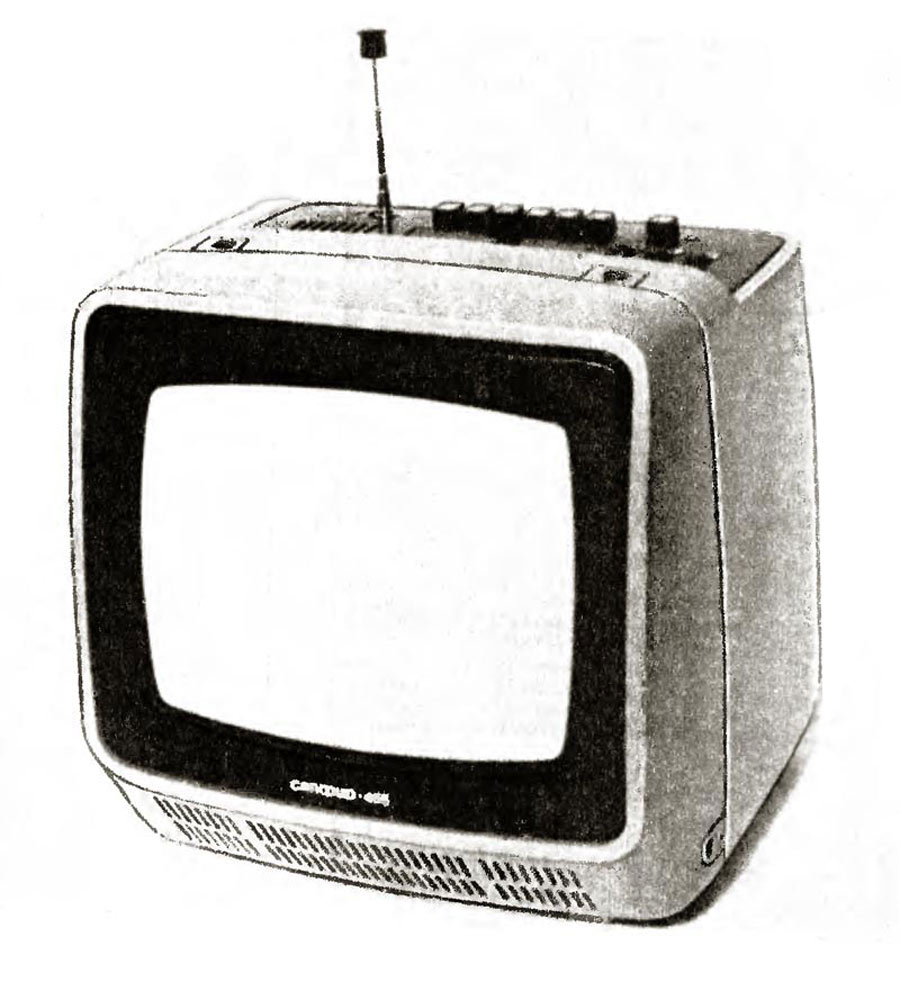 Телевизионный приёмник чёрно-белого изображения *Сапфир-455* с 1987 года опытно выпускало Рязанское ПО *Красное Знамя*. Унифицированный полупроводниково-интегральный телевизор *Сапфир-455* рассчитан на приём телевизионных программ в диапазоне МВ, а при установке селектора каналов СК-Д-22 и в диапазоне ДМВ. В модели установлен взрывобезопасный кинескоп 23ЛК13Б с углом отклонения лучей 90 градусов. Селекторы каналов управляются квазисенсорным устройством УУСК. Приём программ возможен на встроенную телескопическую и наружную антенны, питание универсальное: от сети переменного тока и от автономного источника 12 В. Основные технические характеристики ТВ: Чувствительность по каналу изображения 30 мкВ. Номинальная выходная мощность канала звукового сопровождения 0,2 Вт. Диапазон воспроизводимых звуковых частот не уже 400...3550 Гц. Потребляемая мощность от сети 28 Вт, от аккумулятора 16 Вт. Габариты телевизора - 220х225х230 мм. Масса - 5,5 кг. Цена 165 рублей.