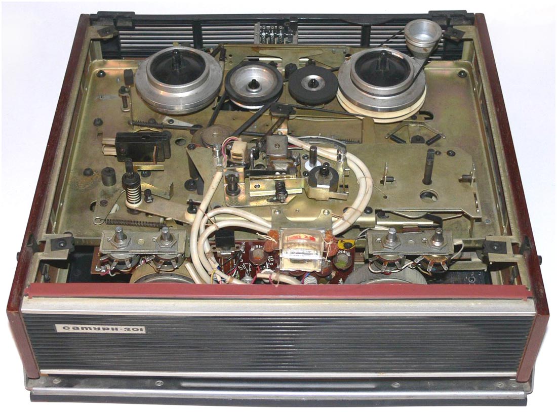 Катушечный транзисторный магнитофон *Сатурн-201* с I-кв 1978 года выпускал Омский электротехнический завод имени Карла Маркса. **Сатурн-201** является аналогом магнитофона **Сатурн-301** выпуска 1973 года. Он предназначен для записи и воспроизведения речевых и музыкальных программ. В модели имеется стрелочный индикатор уровня записи и трёхдекадный счётчик для поиска фонограмм и контроля расхода ленты. Прослушать записи можно через встроенный громкоговоритель, внешнюю АС и головные телефоны. Магнитная лента типа А4407-6Б. Номер катушки 15. Скорость протяжки ленты 19,05 и 9,53 см/с. Время записи на скорости 19,05 см/с - 4х33 минут, 9,53 см/с - 4х65 минут. Диапазон частот звука на ЛВ на скорости 19,05 см/с - 40...18000 Гц, 9,53 см/с - 63...12500 Гц. Коэффициент детонации на скорости 19,05 см/с - ±0,15 %. 9,53 см/с - ±0,25 %. Диапазон регулировки тембра ВЧ, НЧ - 15 дБ. Номинальная выходная мощность при работе на встроенную АС - 2 Вт, внешнюю АС - 6 Вт. Потребляемая от сети мощность 50 Вт. Габариты магнитофона - 412х362х163 мм. Его масса - 11,5 кг.