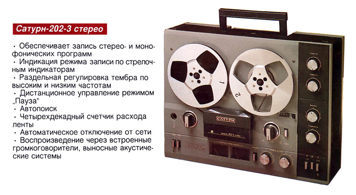 Катушечный стереофонический магнитофон *Сатурн-202-3-стерео* с 1988 года планировал выпускать Омский ЭТЗ им. Карла Маркса. Он создан на базе предыдущей модели **Сатурн-202-2-стерео** от которого отличается встроенными по бокам громкоговорителями и повышенной выходной мощностью усилителей. Магнитофон обеспечивает запись фонограмм с последующим воспроизведением через встроенные громкоговорители, выносные АС и стереотелефоны. Есть возможность: автоматического останова при окончании и обрыве магнитной ленты с переводом ЛПМ в исходное положение; автоматического отключения аппарата от сети; контроля уровня записи по двум стрелочным индикаторам; дистанционного управления режимом «Пауза»; регулировки стереобаланса; раздельной регулировки тембра по ВЧ и НЧ; световой индикации включения сети. Наличие четырёх-декадного счетчика расхода ленты позволяет находить нужные фонограммы, определять расход ленты. В комплекте две АС 10АС-222, 2 микрофона МД-201, 2 катушки (одна с лентой). Тип магнитной ленты А4411-6Б. Номер катушки 18. Скорость ленты: 19,05; 9,53 см/с. Максимальное время записи 2х45; 2х90 мин. Рабочий диапазон частот 40...20000; 63...12500 Гц. Коэффициент детонации 0,13%. Коэффициент гармоник на ЛВ не более 5%. Относительный уровень шумов и помех в канале записи и воспроизведения минус 52 дБ. Максимальная выходная мощность 2х20 Вт. Входное сопротивление АС 4 Ом. Напряжение питания 220 В. Потребляемая мощность 90 Вт. Габариты модели 477х390х210 мм. Вес 18 кг. Отмечу что некоторые партии магнитофона **Сатурн-202-2-стерео** так же имели встроенные громкоговорители.