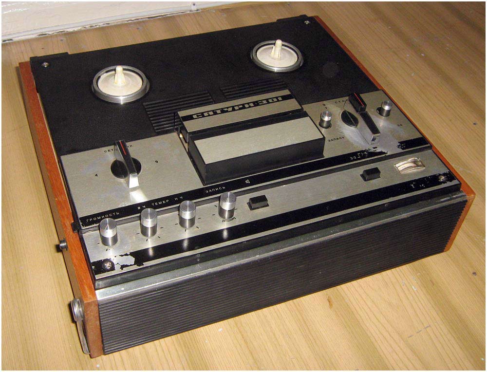 Катушечный транзисторный магнитофон *Сатурн-301* с I-кв 1973 года выпускал Омский Электротехнический завод имени Карла Маркса. Четырёхдорожечный двухскоростной магнитофон **Сатурн-301** предназначен для записи и воспроизведения речевых и музыкальных программ. В магнитофоне имеется индикатор уровня записи, кнопка пауза, регуляторы тембров. Прослушивать запись можно через громкоговоритель, внешнюю АС или же головные телефоны. Магнитная лента А4407-6Б. Номер катушки 15. Скорость движения магнитной ленты 9,53 и 4,76 см/сек. Максимальное время записи на скорости 9,53 см/сек - 4 часа 15 минут, 4,76 см/сек - 8 часов 30 минут. Рабочий диапазон звуковых частот на ЛВ на скорости 9,53 см/сек - 63...12500 Гц, 4,76 см/сек - 63...6300 Гц. Коэффициент детонации на скорости 9,53 см/сек - 0,3 %, 4,76 см/сек - 2 %. Диапазон регулировки тембров по ВЧ и НЧ - 15 дБ. Номинальная выходная мощность при работе на встроенную АС - 2, внешнюю АС - 6 Вт. Потребляемая от сети мощность 45 Вт. Габариты магнитофона - 375х335х141 мм. Его масса 9,5 кг. Цена 185 рублей.