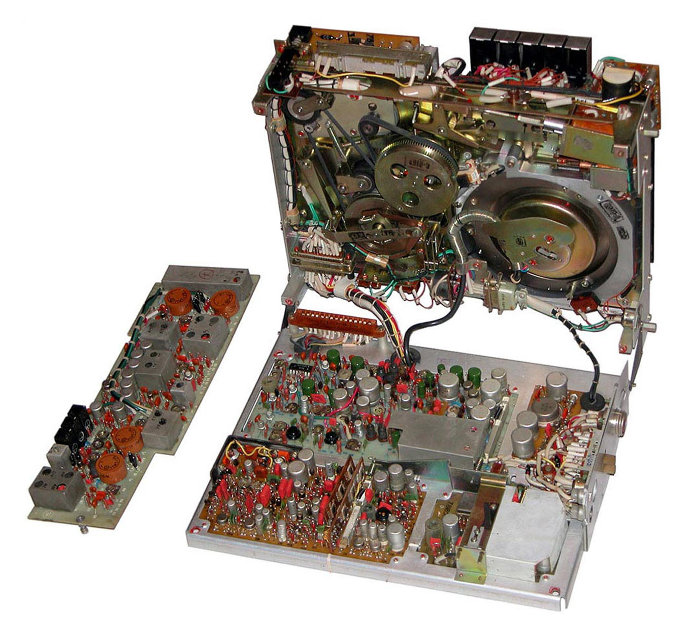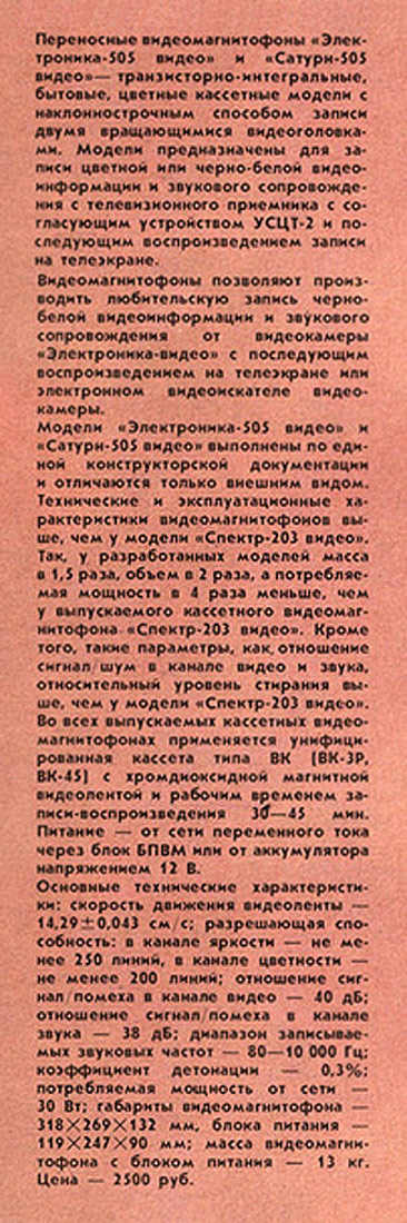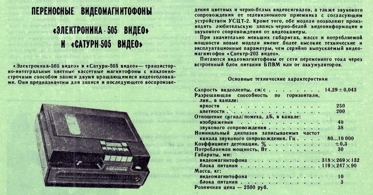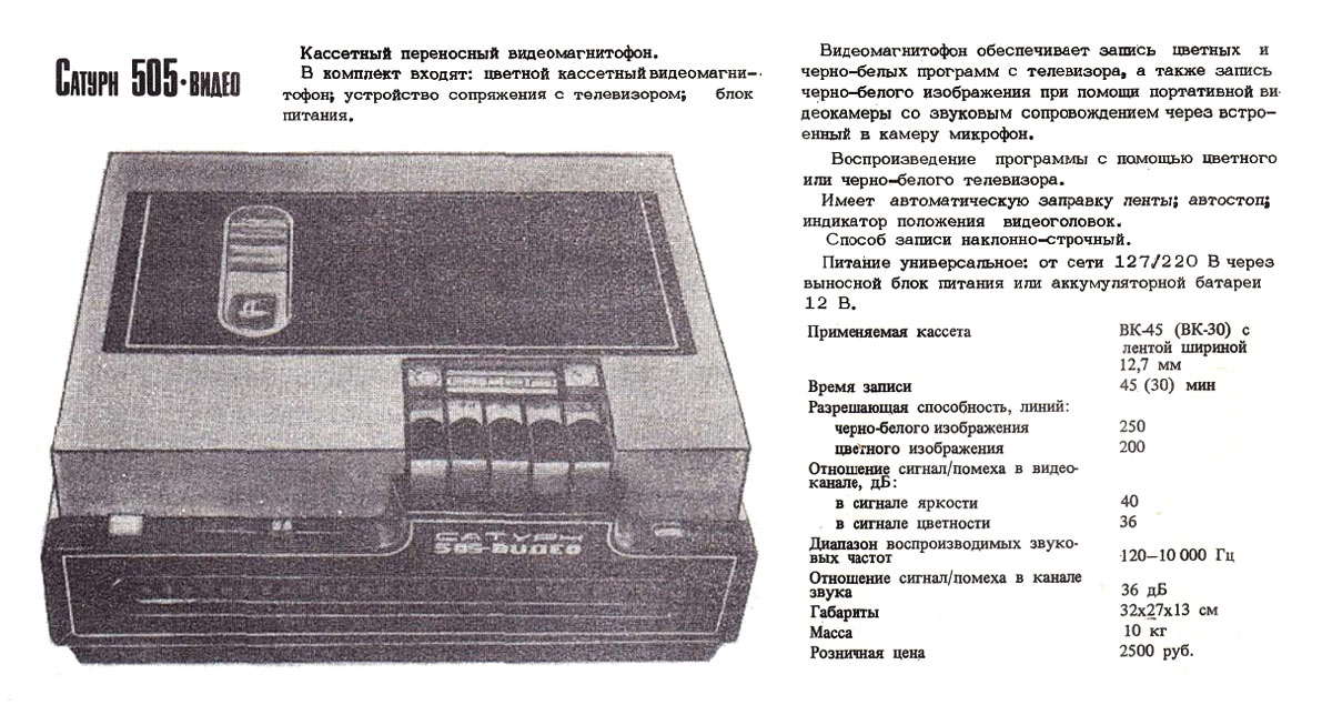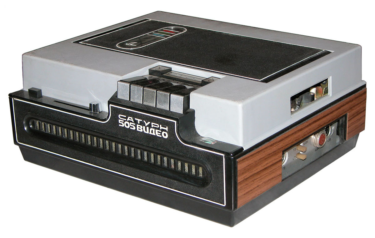 Кассетный видеомагнитофоны *Сатурн-505-видео* с 1979 года выпускал Раменский приборостроительный завод. Видеомагнитофон является копией модели *Электроника-505-Видео*. Это так же транзисторно-интегральный цветной кассетный видеомагнитофон стандарта VCR, с наклонно-строчным способом записи двумя видеоголовками. Видеомагнитофон предназначен для записи и воспроизведения цветных и ч/б видеосигналов и звукового сопровождения от телевизора с согласующим устройством УСЦТ-2. Кроме того ВМ позволяет производить запись ч/б видеоинформации и звукового сопровождения от видеокамеры. Питается аппарат от сети переменного тока через внешний блок питания или от аккумуляторов. Скорость протяжки ленты 14,29 см/с. Разрешающая способность по горизонтали в канале яркости 250 линий, цветности 200 линий. Отношение сигнал/помеха в канале изображения 40 дБ, звукового сопровождения 38 дБ. Диапазон частот канала звука 80...10000 Гц. Коэффициент детонации ± 0,3 %. Потребляемая мощность 30 Вт. Габариты модели - 318x269x132 мм, блока питания - 119x247x90 мм. Масса модели - 10 кг, блока питания - 3 кг. Цена - 2500 рублей.