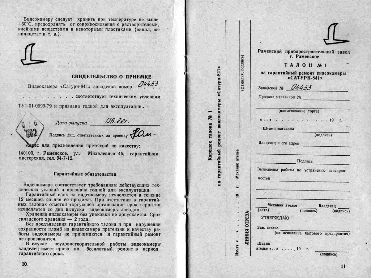 Видеокамера *Сатурн-841* выпускалась предположительно с 1977 года Раменским приборостроительным заводом. ВК предназначена для работы с портативным видеомагнитофоном и служит для преобразования визуальной световой информации в электрическую, с последующей записью ч/б видеосигнала на магнитную ленту видеомагнитофона. Видеокамера аналогична видеокамере *Электроника-841* выпуска 1974 года. Более подробная информация содержится на нескольких страницах инструкции к видеокамере и в описании видеокамеры *Электроника-841* на соответствующей странице сайта.