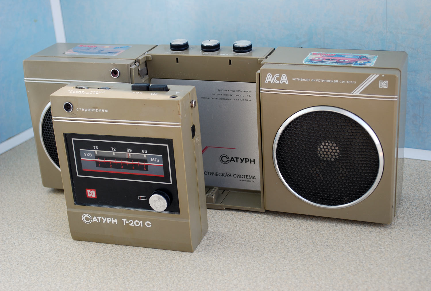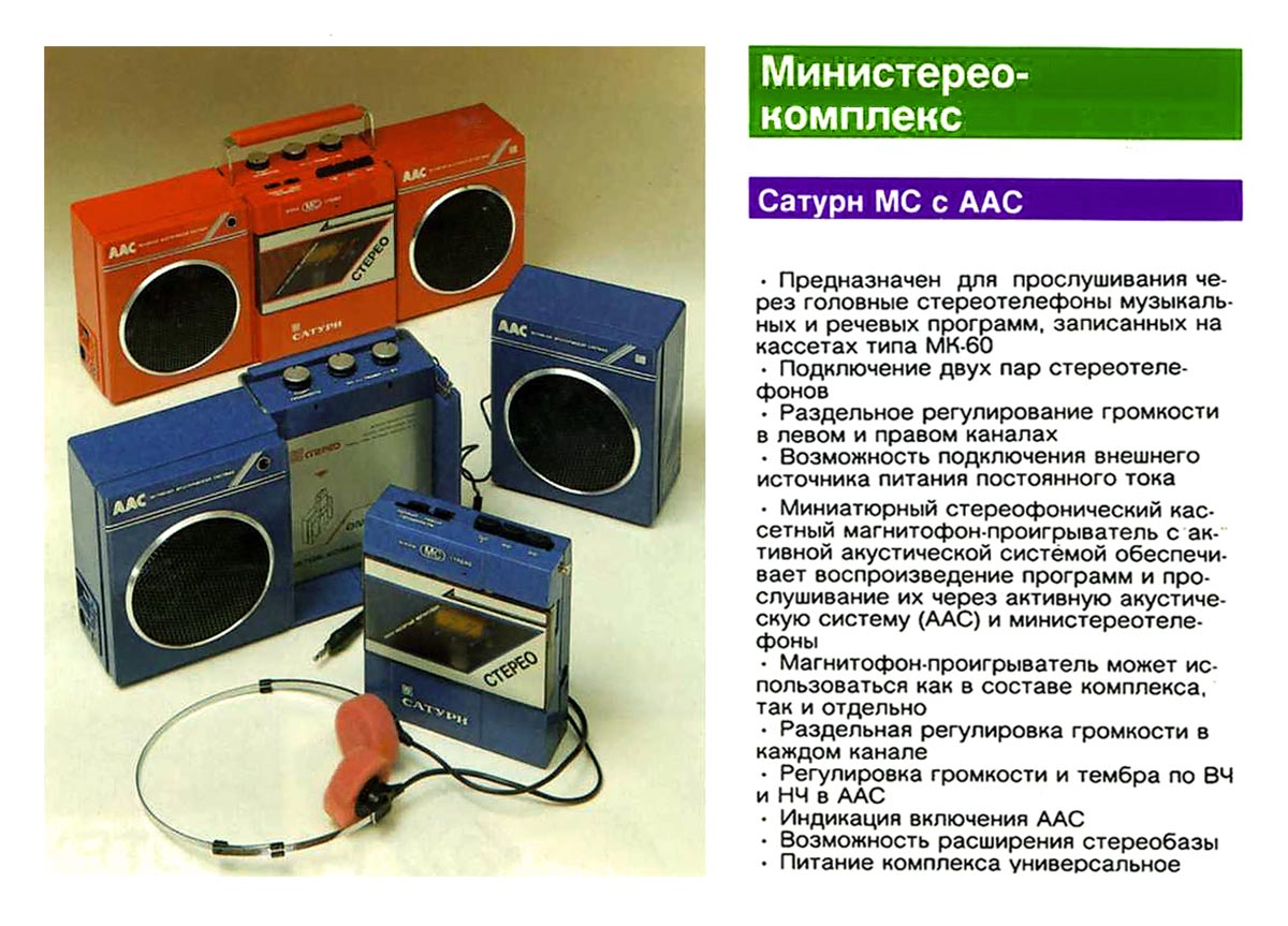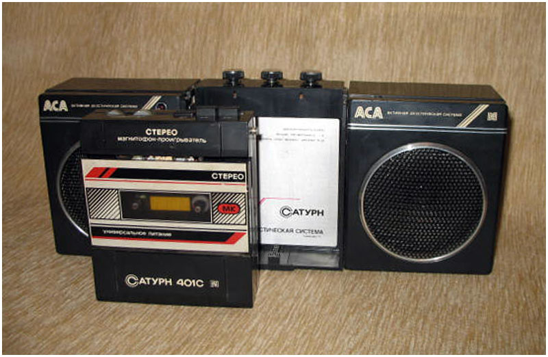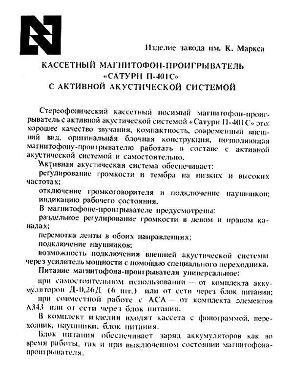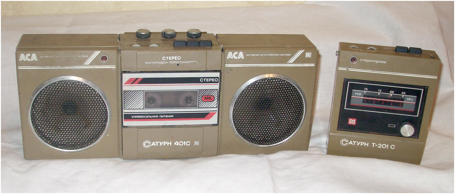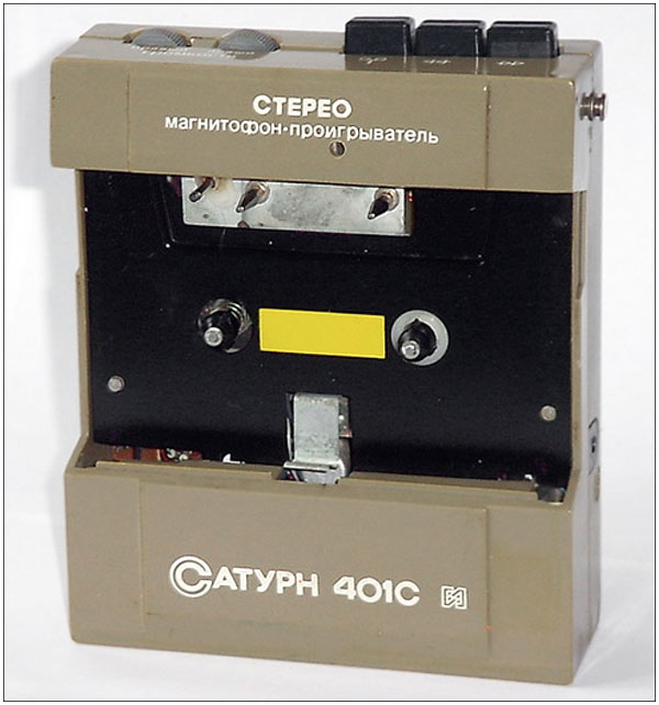 Активная стереосистема и магнитофон-проигрыватель *Сатурн-401С* с 1988 года выпускалась Омским ЭТЗ им. Карла Маркса. Первые выпуски именовались *Сатурн МС*. Стереосистема и магнитофон-проигрыватель **Сатурн-401С** (с 1989 года *Сатурн П-401С*) - переносный, блочный аппарат, состоящий из магнитофона и активной АС с выносным БП. Магнитофон воспроизводит моно и стерео фонограммы с кассет МК-60 на стереофонические телефоны ТДС-13 или на ААС. В плейере имеется раздельная регулировка громкости, ускоренная перемотка ленты в обоих направлениях. Питание плейера осуществляется от аккумуляторов или от сети через БП при совместной работе с ААС. Скорость ленты 4,76 см/с. Коэффициент детонации 0,5%. Диапазон частот 63...10000 Гц. Мощность на выходе телефонов 2,5 мВт. Мощность потребляемая от сети 4 Вт. Габариты плейера 138х337х88 мм. Вес 0,5 кг. ААС состоит из объединенного с громкоговорителем левого канала усилителя и громкоговорителя правого канала. В комплексе есть регулировка громкости и тембров по НЧ и ВЧ. К ААС можно подключить стереотелефоны. Питание комплекса универсальное, от элементов 343 или от сети через блок питания. Номинальная выходная мощность ААС - 2х0,5 Вт. Электрический диапазон воспроизводимых частот ААС - 80...16000 Гц. Диапазон частот воспроизводимых громкоговорителями 120...10000 Гц. Время работы от батарей 10 часов. Габариты ААС - 342х143х85 мм. Масса 2,2 кг. К комплексу выпускался тюнер *Сатурн-Т-201С*, которым можно заменить МП, вытащив его и вставив тюнер или использовать автономно, принимая стереофонические программы УКВ диапазона на стереотелефоны.