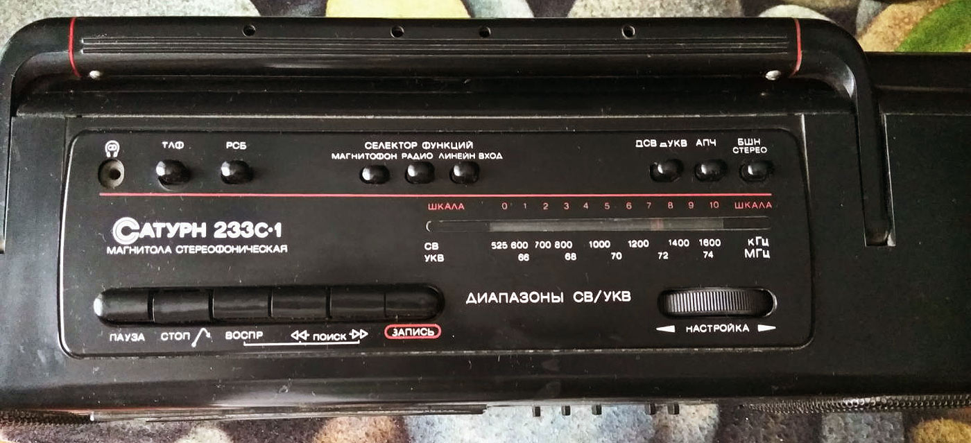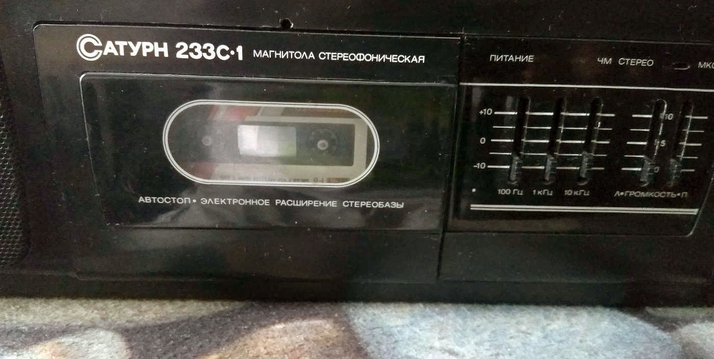Носимая магнитола *Сатурн РМ-233С-1* выпускалась с 1992 года Омским ЭТЗ им. К. Маркса, ПО *Сатурн*. Магнитола состоит из приёмного устройства, работающего в диапазоне СВ, УКВ и кассетного магнитофона, позволяющего записывать фонограммы от встроенного радиоприёмника, электретного микрофона и внешних источников. В магнитоле предусмотрены: АПЧ и бесшумная настройка при приёме ЧМ сигналов, автоматическое переключение режимов моно-стерео, световая индикация включения магнитолы и наличия стереосигнала, АРУЗ, автостоп при окончании ленты в кассете, возможность временного останова ленты, регулировка тембра с помощью трехполосного графического эквалайзера, возможность подключения стереотелефонов и внешних антенн. Магнитола может питаться от сети переменного тока или от 6 элементов А343. Диапазон принимаемых частот: СВ 525...1607 кГц, УКВ 65,8...74 МГц; диапазон воспроизводимых частот 63...12500 Гц; взвешенное отношение сигнал/шум не менее 50 дБ; выходная музыкальная мощность 2X2 Вт; скорость ленты 4,76 см/с; детонация 0,3%; потребляемая мощность 10 Вт; габариты магнитолы 497х137х137 мм; масса 3,5 кг.