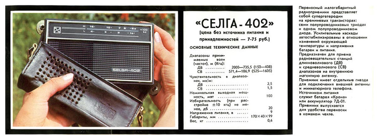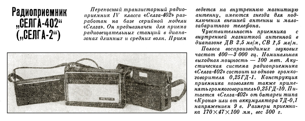 Портативный транзисторный радиоприёмник *Селга-2* с 1970 года выпускал Рижский радиозавод имени А.С.Попова. **Селга-2** - первый отечественный радиоприёмник, в котором были применены кремниевые транзисторы. Приёмник предназначен для приёма радиостанций в диапазонах ДВ и СВ. Приём осуществляется на внутреннюю магнитную антенну, имеются гнёзда для подключения внешней антенны и миниатюрного телефона. Приёмник размещен в кожаном футляре. Принципиальная схема и конструкция, даёт возможность в будущем использовать и интегральные микросхемы. Чувствительность приёмника 1,5 мВ/м. Селективность по соседнему каналу 20 дБ. Номинальная выходная мощность 100 мВт, максимальная 200 мВт. Габариты приёмника 170 х 100 х 47 мм. Его масса 500 грамм. Питание радиоприёмника *Селга-2* производится от батареи **Крона ВЦ** или аккумуляторной батареи **7Д-0,1**. С осени 1970 года номерное наименование радиоприёмника, где цифра *2* обозначала номер разработки, сменилось на *Селга-402*, где цифра *4* уже обозначала класс, а цифра *2* после нуля - порядковый номер разработки.