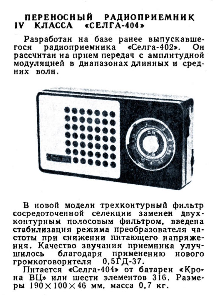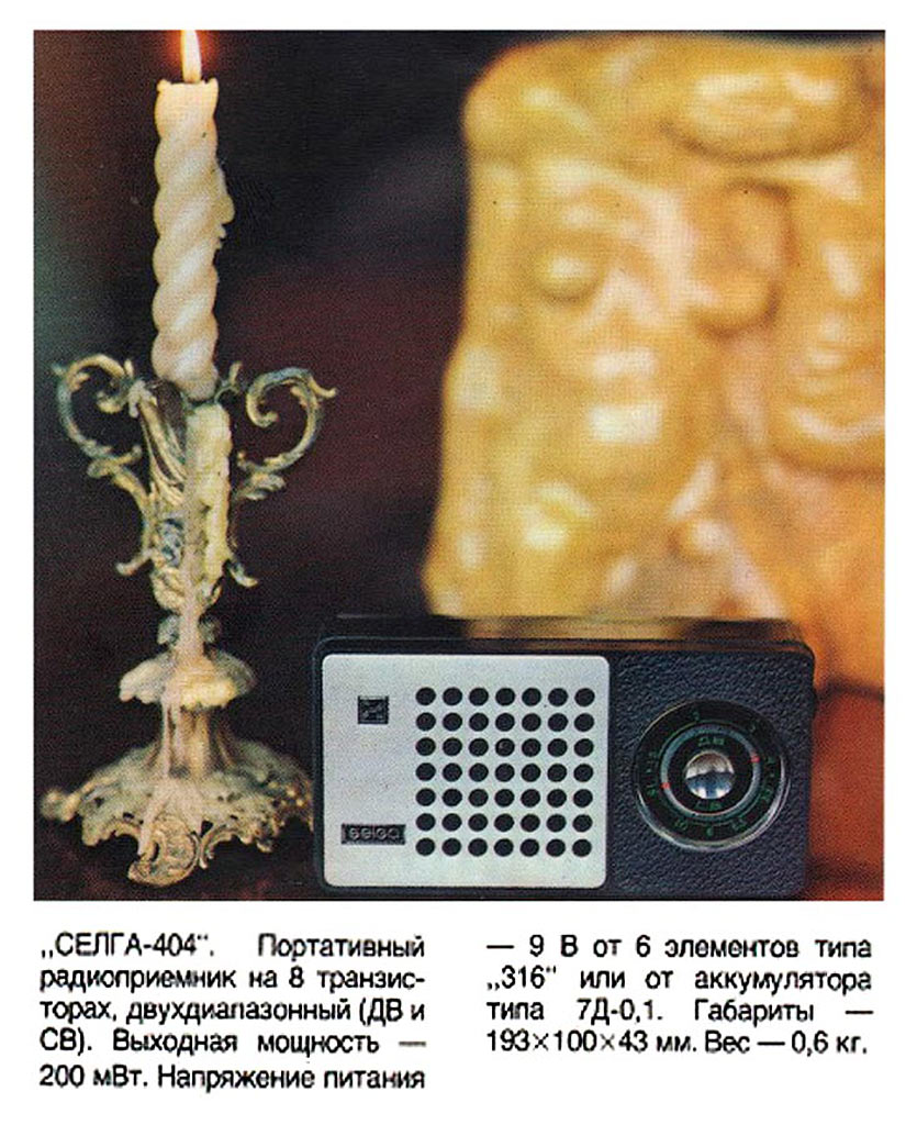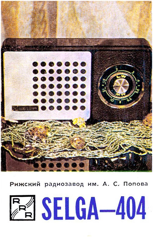 Портативный радиоприёмник *Селга-404* с 1973 года выпускал Рижский радиозавод имени Попова. Радиоприёмник разработан на основе модели **Селга-402** и рассчитан на приём в диапазонах ДВ, СВ. 3-х контурный ФСС в усилителе ПЧ заменен 2-х контурным полосовым фильтром, введена стабилизация гетеродина. Качество звука и громкость благодаря применению нового громкоговорителя 0,5ГД-37 значительно улучшились. Чувствительность приёмника **Селга-404** в ДВ диапазоне 1,2 мВ/м, СВ - 0,6 мВ/м. Избирательность по соседнему каналу не менее 26 дБ. Питается приёмник от батареи *Крона ВЦ* или от шести элементов А-316. Габариты приёмника - 190 х 100 х 46 мм, масса 0,7 кг. Цена приёмника в основной комплектации 32 рубля 67 копеек. Экспортные радиоприёмники имели наименование *Comix* и *Vega*. Выпускали радиоприёмники *Селга-404* только в одной цветовой гамме (чёрный цвет).