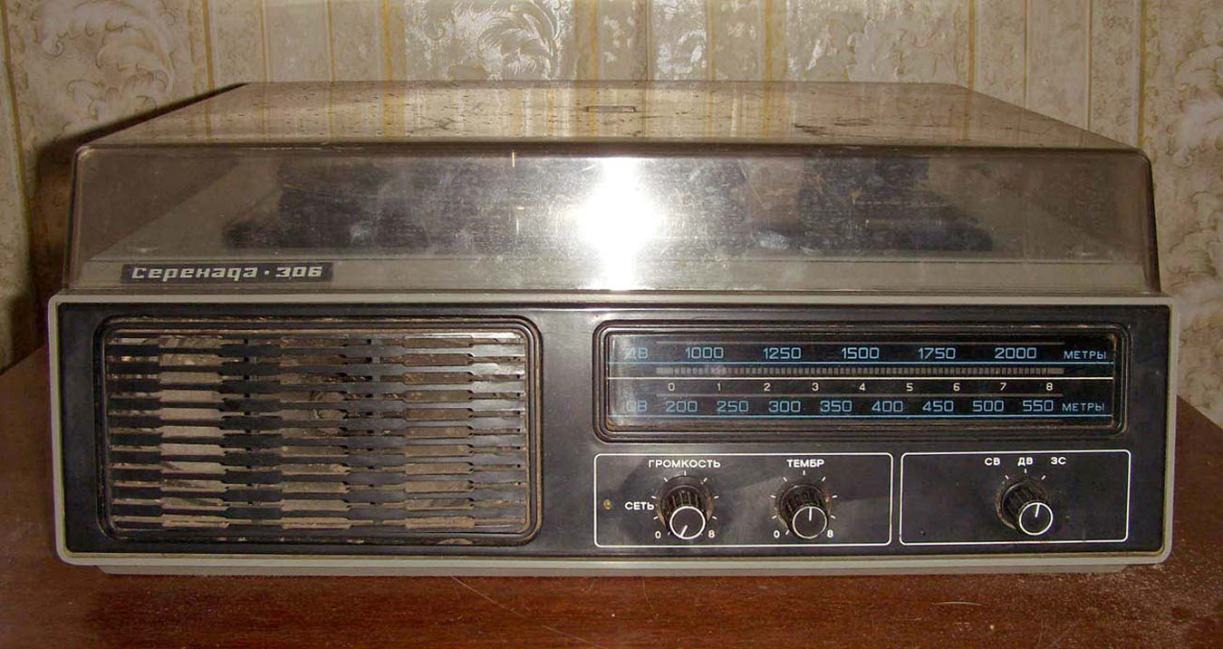 Стационарная транзисторная радиола *Серенада-306* с I-кв 1984 года выпускалась Владивостокским завод *Радиоприбор*. Радиола **Серенада-306** состоит из двухдиапазонного транзисторного радиоприёмника и 2-х скоростного электропроигрывающего устройства III-ЭПУ-38М. В радиоле имеется плавная регулировка громкости и тембра по ВЧ. ЭПУ имеет микролифт и автостоп. Корпус у радиолы из пластмассы и дерева. Чувствительность на обоих диапазонах 70 мкВ. Номинальная выходная мощность - 1 Вт, максимальная - 2 Вт. Номинальный диапазон воспроизводимых звуковых частот приёмного тракта - 160...3500 Гц, механической записи не уже - 160...10000 Гц. Частота вращения диска электропроигрывателя 33,33 и 45,11 об/мин. Коэффициент детонации 0,3 %. Уровень рокота 28 дБ. Потребляемая мощность 25 Вт. Габариты радиолы 400х310х152 мм. Вес 7,5 кг. Цена 62 рубля.