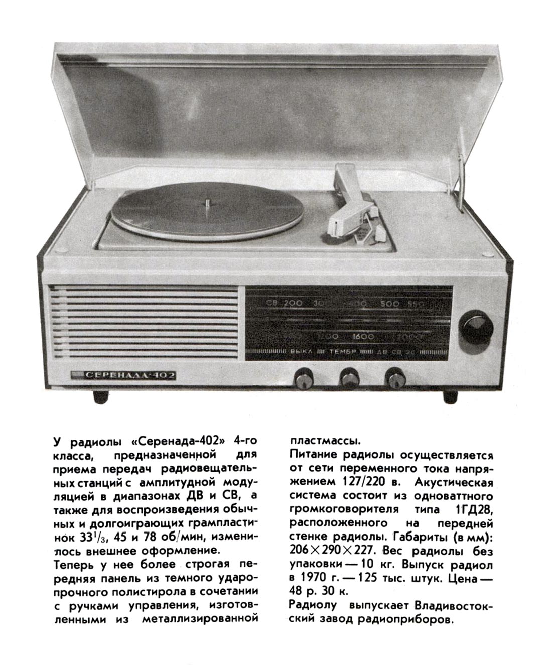 Сетевая ламповая радиола четвёртого класса *Серенада-402* с 1973 года производилась Владивостокским заводом *Радиоприбор*. Радиола предназначена для приёма вещательных радиостанций в диапазонах ДВ, СВ и для проигрывания грампластинок. Радиола создана на основе радиолы **Серенада** и отличается от неё новой конструкцией и оформлением. По своей электрической схеме и характеристикам радиолы аналогичны. Габариты радиолы 206х447х290 мм. Масса 10 кг. За время выпуска радиолы ЭПУ 3-ЭПУ-28М было заменено на 3-ЭПУ-38, передняя панель была светлого и тёмного цвета (редко). Цена была 48 рублей 30 копеек, 51 и 52 рубля.