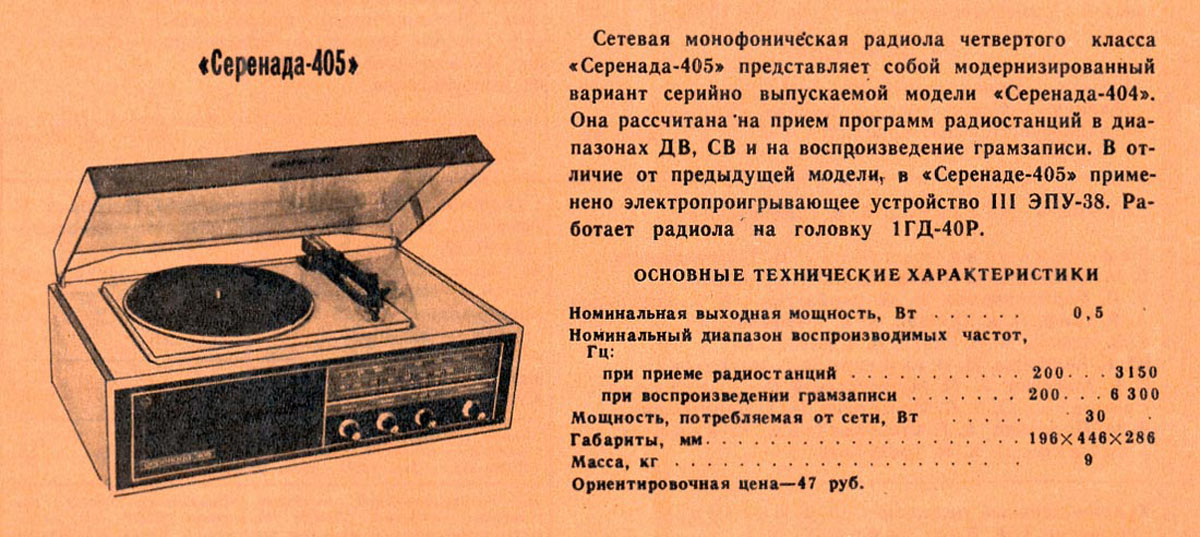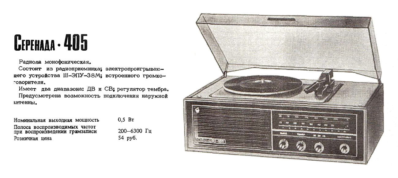 Стационарная транзисторная радиола *Серенада-405* с начала 1978 года выпускалась Владивостокским заводом *Радиоприбор*. Монофоническая радиола 4-го класса **Серенада-405** является модернизацией модели **Серенада-404**. Новая модель рассчитана на приём радиостанций в ДВ, СВ диапазонах, а также на воспроизведение грамзаписи с грампластинок всех форматов. В радиоле установлено двухскоростное ЭПУ типа III-ЭПУ-38 или другое. Работает радиола на АС с динамической головкой 1ГД-40Р. Чувствительность в диапазонах ДВ, СВ - 250...300 мкВ. Селективность 26 дБ. Номинальная выходная мощность 0,5, максимальная 0,8 Вт. Диапазон воспроизводимых частот при приёме радиостанций 200...3150 Гц, при воспроизведении грамзаписи 200...6300 Гц. Питание - электрическая сеть 127 или 220 В. Мощность, потребляемая от сети 30 Вт при работе ЭПУ и 18 Вт при радиоприёме. Габариты радиолы - 196 х 446 х 286 мм. Вес без упаковки 9, с упаковкой 11 кг.
