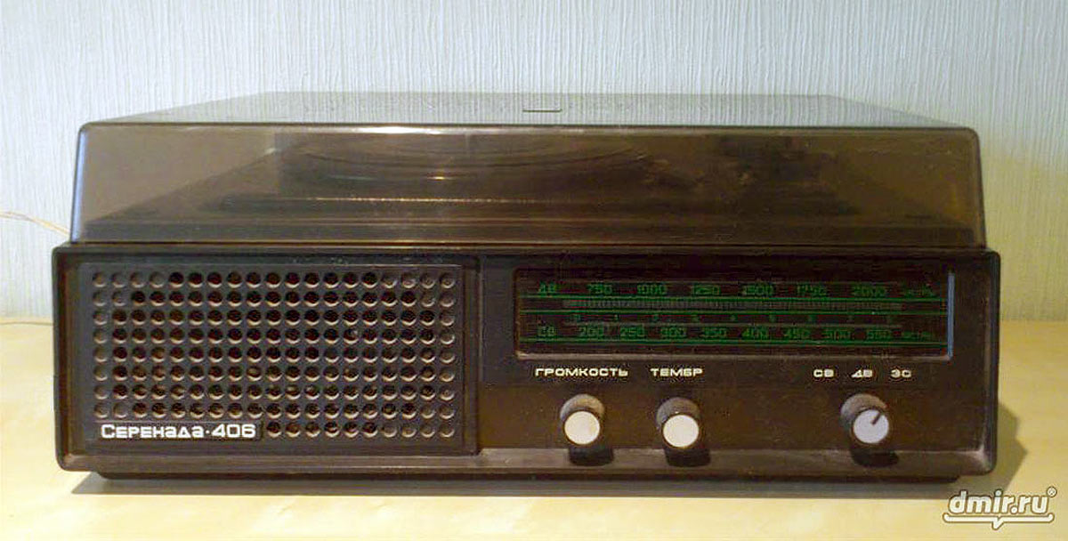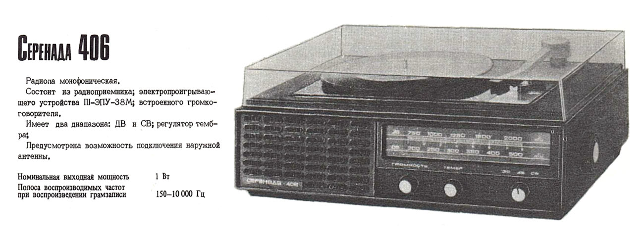 Стационарная транзисторная радиола *Серенада-406* с 1980 года выпускалась Владивостокским заводом *Радиоприбор*. **Серенада-406** - транзисторная радиола 4 класса, предназначенная для приёма в диапазонах ДВ, СВ и воспроизведения звукозаписи с грампластинок при помощи ЭПУ 3-ЭПУ-38М. Радиола имеет гнёзда для внешней антенны и заземления. Питание осуществляется от электрической сети 220 В. Диапазоны ДВ - 150...405 кГц, СВ - 525...1605 кГц. Чувствительность в диапазоне ДВ - 200 мкВ, СВ - 150 мкВ. Селективность по соседнему каналу - 26 дБ. Коэффициент гармоник - 4...6 %. Номинальная выходная мощность - 1 Вт, максимальная - 2 Вт. Диапазон воспроизводимых частот в диапазонах ДВ, СВ 150...3550 Гц, при воспроизведении грамзаписи 150...10000 Гц. Габариты радиолы 152х310х400 мм. Вес 7,5 кг.
