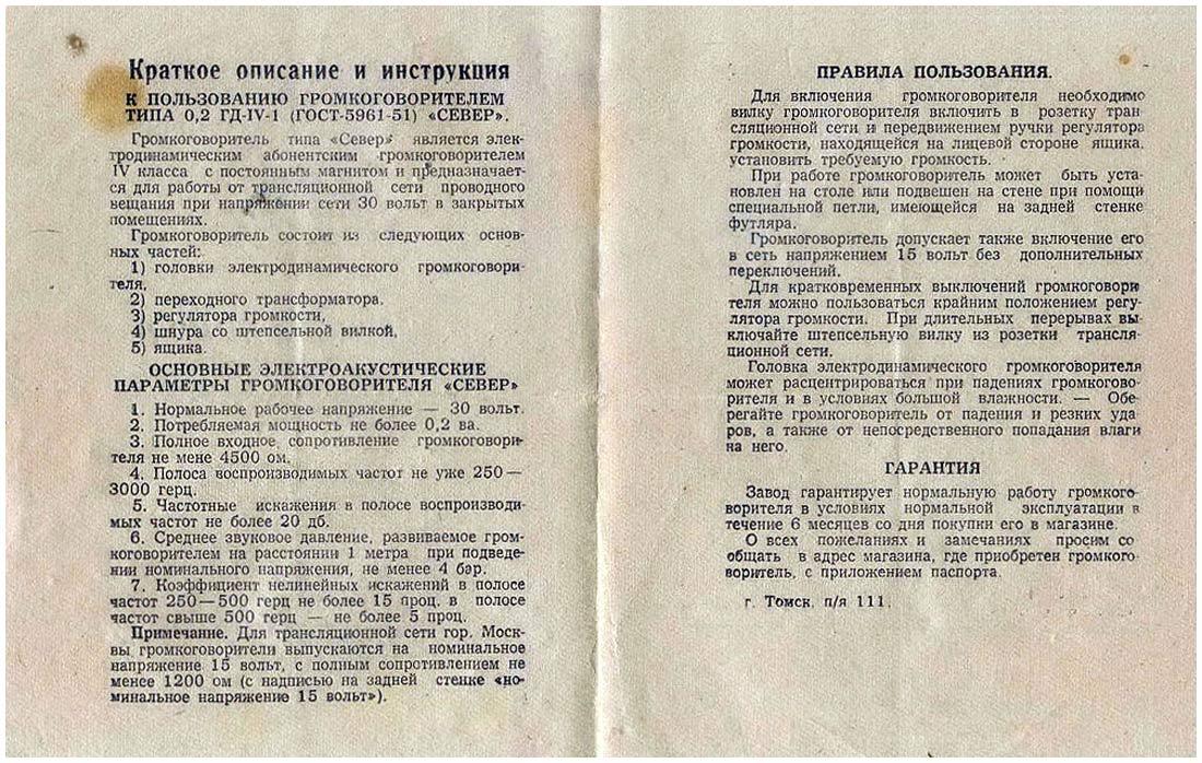 Абонентский громкоговоритель "Север" с 1952 года выпускал Томский завод измерительной аппаратуры. Стандартный абонентский громкоговоритель 4-го класса по ГОСТ 5961-51 для 30-ти вольтовой радиотрансляционной сети. Регулятор громкости, обеспечивает её изменение на 20 дБ. Номинальная потребляемая мощность 0,2 Вт. Полоса воспроизводимых звуковых частот 250...3000 Гц. Входное сопротивление 4,5 кОм. Габариты АГ - 230х300х110 мм. Масса 2,5 кг. Для Московской городской сети громкоговоритель выпускался на напряжение 15 вольт.