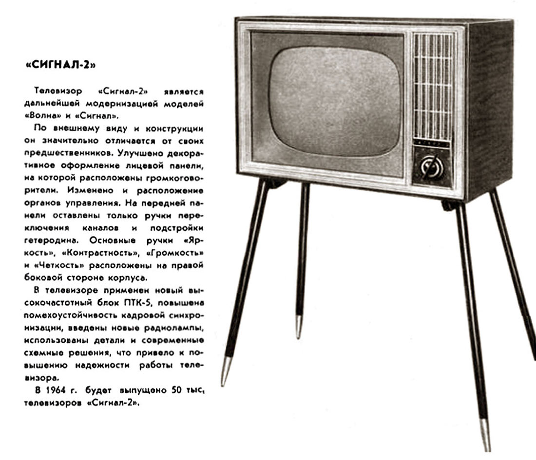 Телевизионный приёмник чёрно-белого изображения *Сигнал-2* с октября 1964 года выпускал *Ленинградский завод имени Козицкого*. Телевизор **Сигнал-2** (ЗК-45) создан на базе предыдущей модели **Сигнал**, практически аналогичен ему и отличается лишь новыми ПЧ и более современным оформлением. Немного увеличен размер видимого изображения до 270х370 мм. АС, состоящая из двух широкополосных громкоговорителей типа 1ГД-9 расположенных фронтально в правой передней части при подводимой мощности в 1 Вт и в диапазоне частот от 100 до 7000 Гц обеспечивает хорошее качество звука. Два раздельных регулятора тембра по НЧ и ВЧ позволяют подобрать желаемый тембр звучания. В телевизоре имеются гнёзда для головных телефонов и подключения магнитофона на запись звукового сопровождения телепередач. Футляр у телевизора деревянный полированный, с имитацией под ценные породы дерева. Основные регуляторы для управления расположены сзади справа, дополнительные слева. Размеры телевизора - 600 х 440 х 395 мм. Масса 32 кг. Розничная цена 336 рублей. С середины 1965 года завод производил улучшенный телевизор **Сигнал-2М** (ЗК-45М) где при точно таком же оформлении, был улучшен звуковой канал, видеоусилитель, блок питания и блок строчной развёртки.