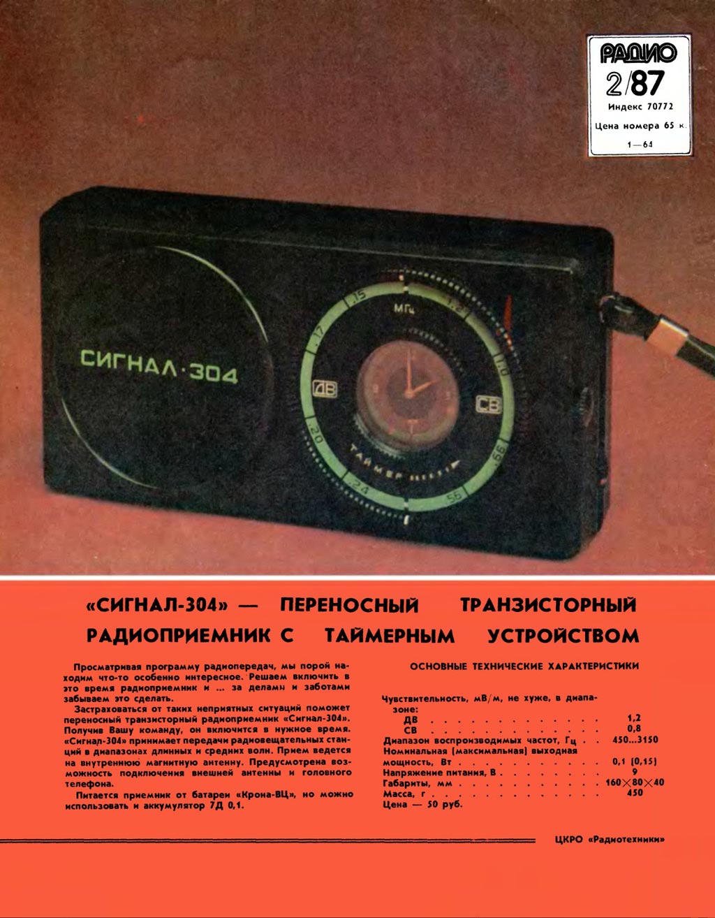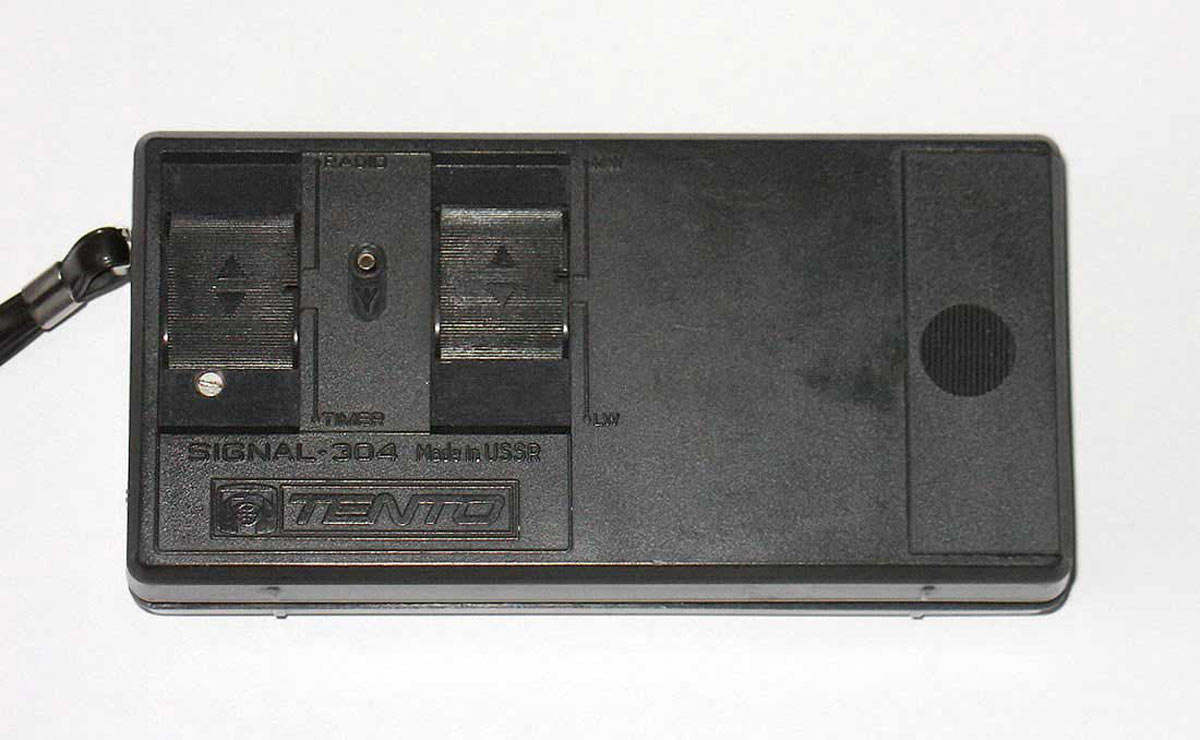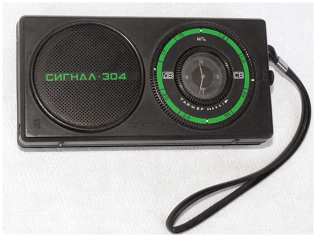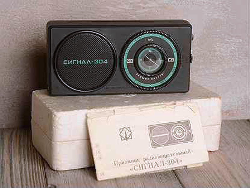 Радиоприёмник с часами и таймером *Сигнал-304* с 1985 года выпускал Каменск-Уральский ПСЗ. Приёмник 3-й группы сложности с часами и таймером **Сигнал-304** обеспечивает приём в диапазонах ДВ и СВ. Таймерное устройство обеспечивает отсчет текущего времени и автоматическое включение приёмника на 30 минут в установленное время. Имеются разъёмы для подключения внешней антенны и миниатюрного телефона. Питание от батареи Крона ВЦ или аккумулятора 7Д-0115. Корпус из ударопрочного полистирола чёрного цвета (был и серо-коричневый). Чувствительность в диапазонах ДВ 1,2, СВ 0,8 мВ/м. Диапазон воспроизводимых звуковых частот 450...3150 Гц. Номинальная выходная мощность 0,1, максимальная 0,15 Вт. Габариты приёмника 160х80х40 мм. Масса 450 г.
