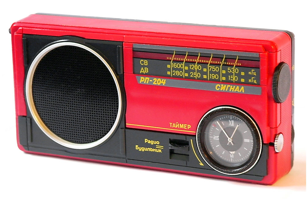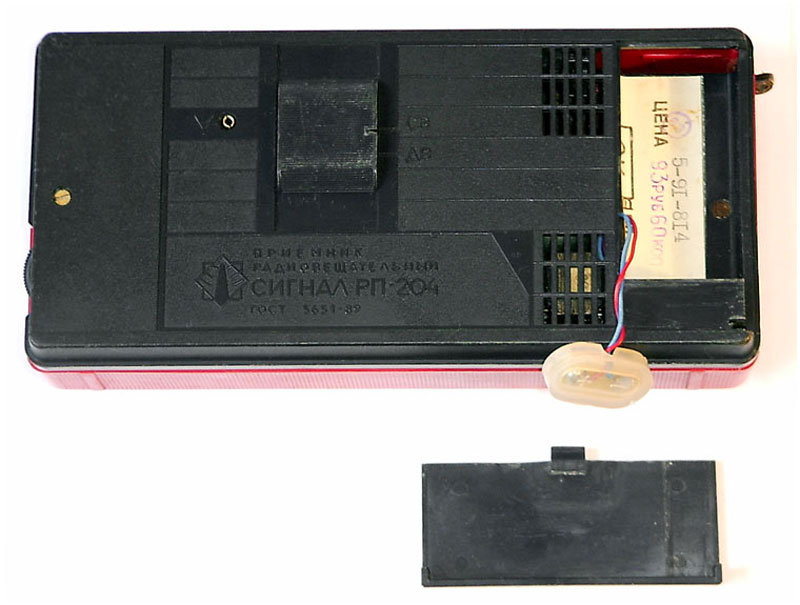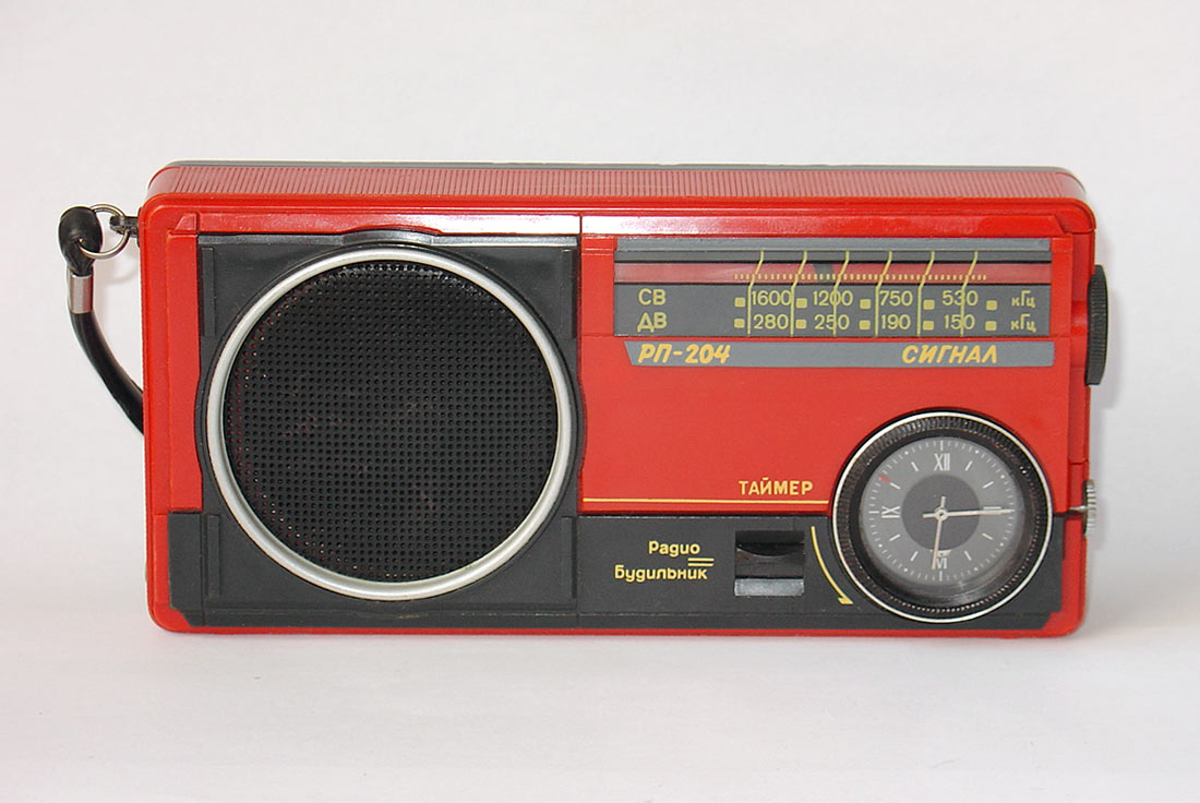 Радиоприёмник с таймером и часами *Сигнал РП-204* с начала 1989 года выпускал Каменск-Уральский ПСЗ. Радиоприемник предназначен для приёма в диапазонах ДВ и СВ на внутреннюю магнитную антенну. В приёмнике имеются гнёзда для подключения головного телефона, внешней антенны и источника питания. Время работы приёмника от свежей батареи при работе около 4-х часов в сутки и средней громкости 40 часов. Радиоприёмник имеет таймер, который кроме отсчета времени позволяет автоматически включать приёмник на 30 мин. в заданное время. Чувствительность в диапазонах: ДВ 2,5, СВ 1,5 мВ/м. Односигнальная избирательность 30 дБ. Максимальная выходная мощность 0,15 Вт. Диапазон воспроизводимых частот 450...3150 Гц. Питание от батареи **Корунд**. Размеры приемника - 165x80x37 мм. Масса - 0,45 кг.
