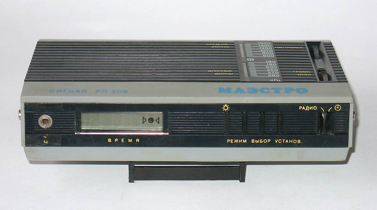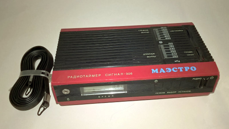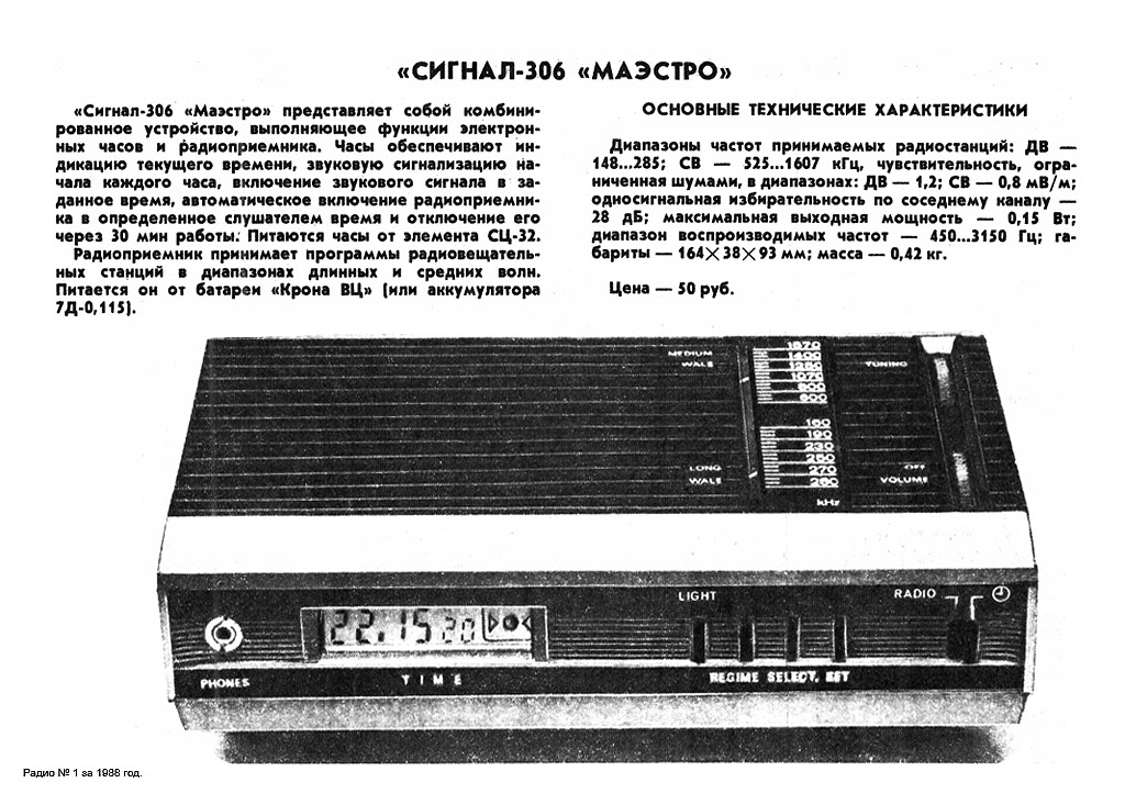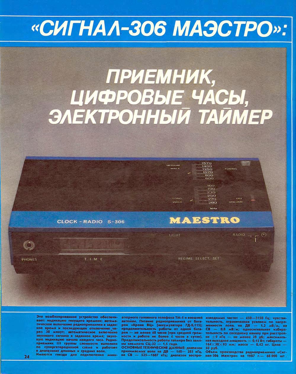 Портативный радиоприёмник *Сигнал-306* (Маэстро) с I-кв 1987 года выпускал Каменск-Уральский приборостроительный завод. Радиоприёмник **Сигнал-306** - это комбинированное устройство (радиотаймер) выполняющее функции электронных часов и радиоприёмника.Часы обеспечивают индикацию времени, сигнализацию начала каждого часа звуковым сигналом, включение звукового сигнала в нужное время, автоматическое включение радиоприёмника в заданное время и отключение через 30 минут работы. Питаются часы одним элементом типа СЦ-32. Питается приёмник от батареи Крона-ВЦ. Диапазоны волн: ДВ - 148...285; СВ - 525...1607 кГц, чувствительность, ограниченная шумами, в диапазоне: ДВ - 1,2; СВ - 0,8 мВ/м; избирательность по соседнему каналу - 28 дБ; выходная мощность усилителя низкой частоты (максимальная) 0,15 Вт; диапазон воспроизводимых звуковых частот 450...3150 Гц; габариты устройства - 164х38х93 мм; вес 0,42 кг. Цена 50 рублей 60 копеек. С 1989 года по новому ГОСТ-у завод выпускал приёмник *Сигнал РП-206*, по конструкции и оформлению одинаковый с вышеописанным.