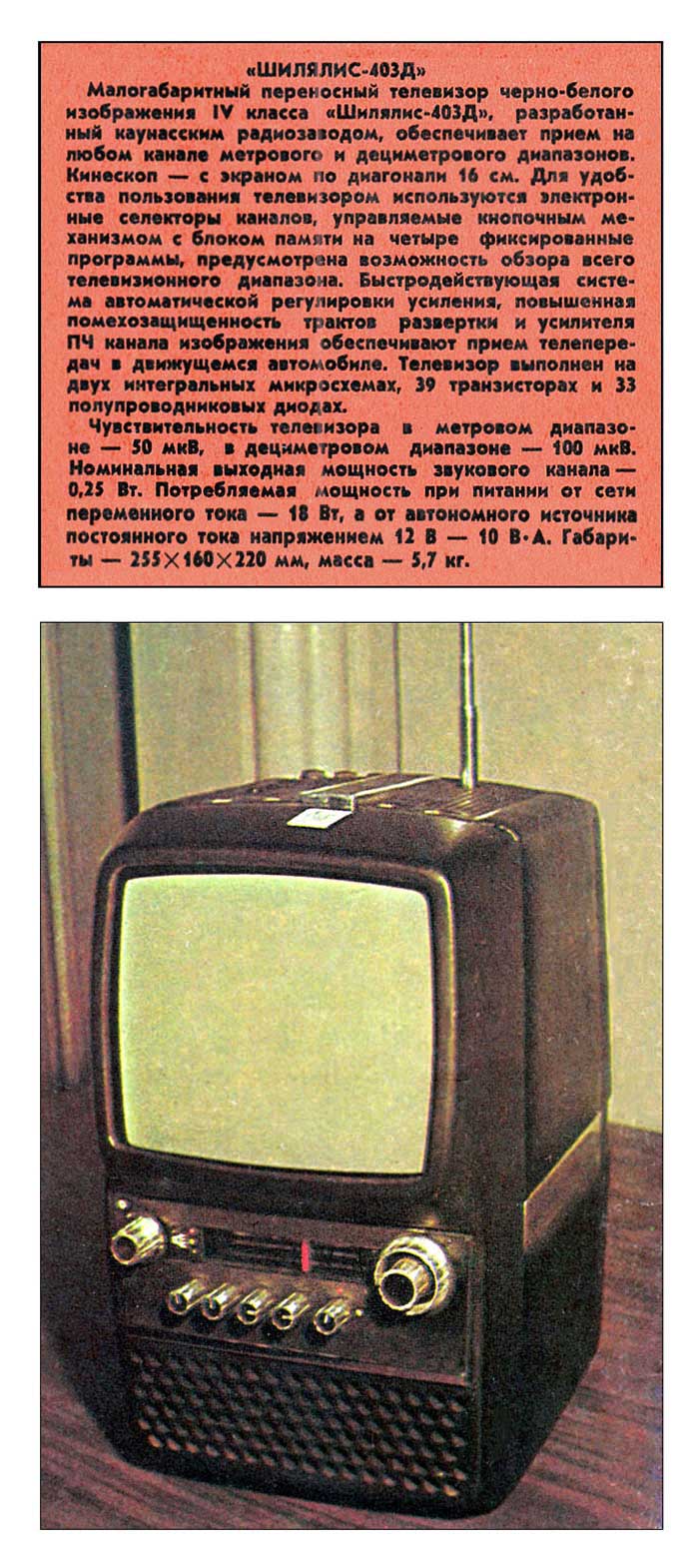 Телевизионный приёмник ч/б изображения *Шилялис-403Д* с 1977 года выпускал Каунасский радиозавод. Малогабаритный, переносный телевизор 4-го класса **Шилялис-403Д** обеспечивает приём на любом канале МВ и ДМВ диапазонов. Кинескоп установлен с размером 16 см по диагонали. В модели используются электронные селекторы каналов, управляемые кнопочным механизмом с блоком памяти на четыре фиксированные программы, имеется обзор всего ТВ диапазона. Быстродействующая система АРУ, а также повышенная помехозащищенность трактов блока развертки и УПЧ изображения обеспечивают приём с антенной *АТА-1* даже в движущемся автомобиле. Телевизор выполнен на 2 интегральных микросхемах, 39 транзисторах и 33 диодах. Чувствительность в МВ диапазоне - 50 мкВ, в ДМВ - 100 мкВ. Выходная мощность канала звука - 0,25 Вт. Диапазон воспроизводимых частот - 300...5100 Гц. Потребляемая мощность от сети - 18 Вт, автономного источника напряжением 12 В - 10 Вт. Габариты ТВ - 255х160х220 мм. Масса 5,7 кг.