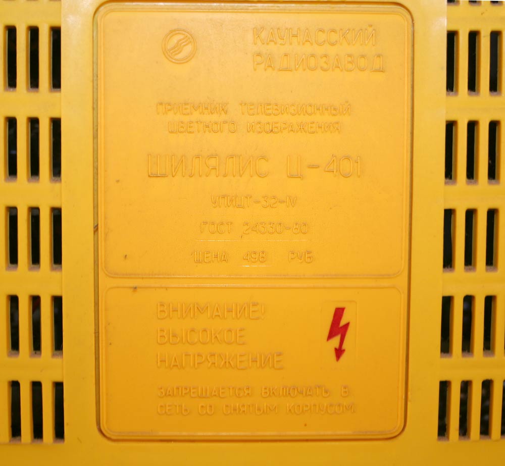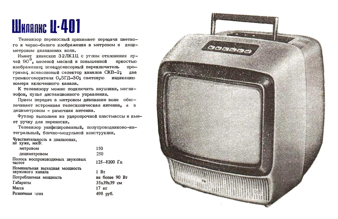 Телевизионный приёмник цветного изображения *Шилялис Ц-401* с 1978 года выпускал Каунасский радиозавод. Цветной блочно-модульный телевизор **Шилялис-Ц401** рассчитан на приём цветных и ч/б передач в МВ и ДМВ диапазонах. В телевизоре применён кинескоп 32ЛК1Ц, с размером диагонали экрана 32 см и электронный блок выбора программ, обеспечивающий предварительную настройку на шесть каналов МВ или ДМВ диапазона. Выбор программ осуществляется нажатием на кнопку псевдосенсорного переключателя. В модели имеются разъёмы для подключения головных телефонов, пульта ДУ, магнитофона на запись звукового сопровождения, видеомагнитофона. Размер изображения 182х246 мм. Чёткость по горизонтали 300 линий, по вертикали 400 линий. Номинальная выходная мощность 0,1 Вт. Питание от сети 220 В или источника постоянного тока 12 В. Мощность потребляемая от сети 100 Вт, от аккумулятора 60 Вт. Размеры модели 355х390х385 мм. Вес 17 кг.