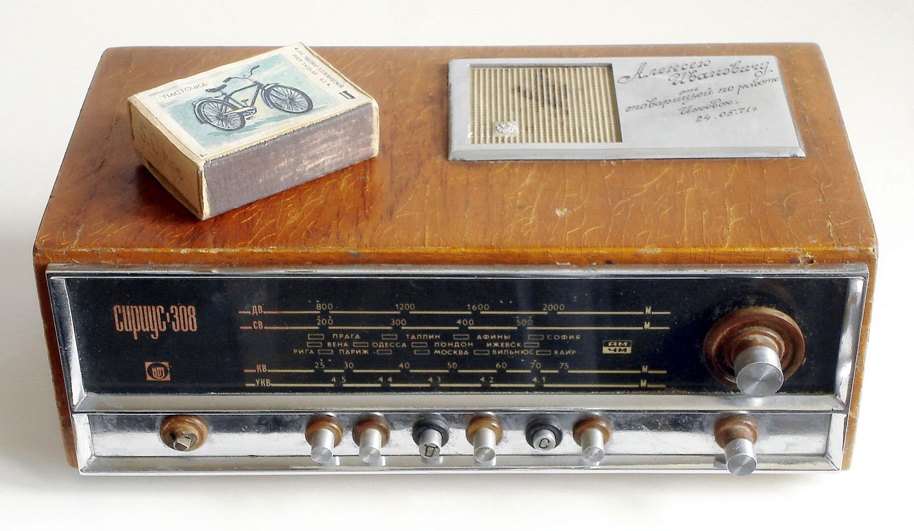 Сувенирный радиоприёмник *Сириус-308* в 1971 году выпущен весьма ограниченной серией Ижевским радиозаводом. Радиоприёмник предназначался для награждения отличившихся чем либо работников Ижевского радиозавода. Основой для сувенира стала плата радиоприёмника *Вега* 1968 года выпуска. Радиоприёмник имеет как и базовая плата диапазоны ДВ и СВ. Не настаиваю, я лично не видел, но думаю что КВ и УКВ диапазоны - бутафорские, то есть обозначены на шкале, имеют пустые кнопки, но реально не работают, так как в приёмнике нет соответствующей элементной базы. Нет даже указателя настройки (стрелки). Питание от батареи типа *Крона*. Все технические параметры сувенира соответствуют радиоприёмнику *Вега*. Габариты модели - 200 х 115 х 75 мм. Масса около 1,5 кг.