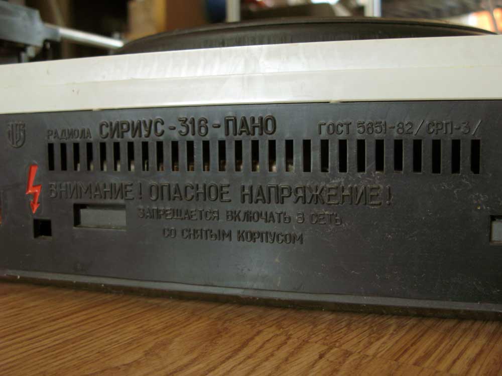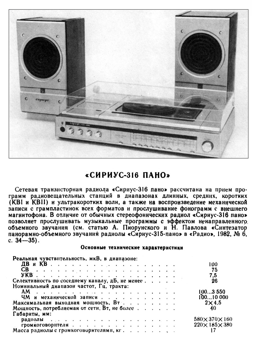 Стационарная транзисторная радиола *Сириус-316-Пано* с 1985 года выпускалась Ижевским радиозаводом. Транзисторная радиола **Сириус-316-Пано** рассчитана на приём программ радиостанций в диапазонах ДВ, СВ, КВ (2 поддиапазона) и УКВ, на воспроизведение грампластинок любых форматов и прослушивание фонограмм с внешнего магнитофона. Особенность модели - это прослушивание монофонических программ и с псевдо стереоэффектом ненаправленного объемного звучания. Реальная чувствительность приёмника в диапазонах ДВ, СВ, КВ 75..100 мкВ, на УКВ 7,5 мкВ. Селективность по соседнему каналу в АМ тракте 26 дБ. Диапазон воспроизводимых частот звука в тракте АМ 100-3550 Гц, ЧМ и грамзаписи 100...10000 Гц. Максимальная выходная мощность - 2х4,5 Вт. Потребляемая мощность - 40 Вт. Габариты модели - 580х370х160 мм. Одной АС - 220х185х380 мм. Масса с АС - 17 кг.