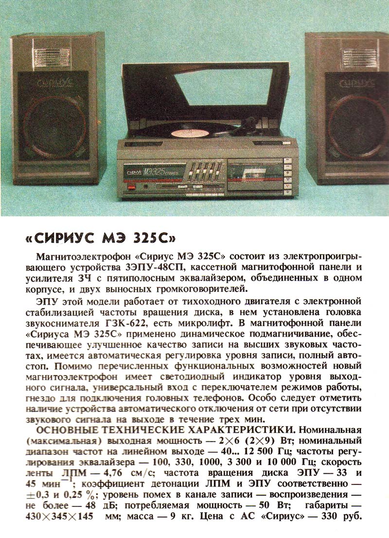 Магнитоэлектрофон *Сириус МЭ-325-стерео* с 1988 года выпускал Ижевский радиозавод. Комбинированное устройство состоит из ЭПУ типа 3-ЭПУ-48СП, кассетной магнитофонной панели и усилителей с 5-полосным эквалайзером, объединённых в одном корпусе и выносных АС. ЭПУ работает от тихоходного двигателя с электронной стабилизацией частоты вращения диска, в тонарме установлена головка типа ГЗК-622, есть микролифт. В МП применено динамическое подмагничивание обеспечивающее улучшенное качество записи на высших частотах, есть АРУЗ, полный автостоп. Имеется светодиодный индикатор уровня сигнала на выходе, универсальный вход с переключателем режимов работы гнездо головных телефонов, устройство автоотключения от сети при отсутствии сигнала на выходе в течение 3 минут. Номинальная (максимальная) выходная мощность 2х6 (2х9) Вт, диапазон звуковых частот на линейном выходе 40...12500 Гц, частоты регулирования в эквалайзере 100, 330, 1000, 3300, 10000 Гц, скорость ЛПМ - 4,76 см/с, частота вращения диска ЭПУ - 33/45 об/мин, коэффициент детонации ЛПМ / ЭПУ ±0,3 / 0,25%, уровень помех в канале записи/воспроизведения -48 дБ потребляемая мощность 50 Вт, габариты аппарата - 430х345х145 мм. Масса - 9 кг.