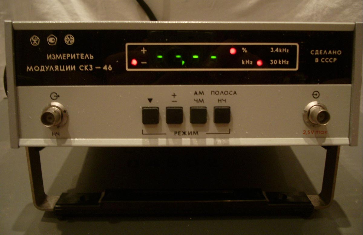 Измеритель модуляции *СК3-46* выпускался предположительно с 1987 года. Предназначен для измерения девиации частоты ЧМ сигналов и коэффициента АМ сигналов. Прибором может быть также измерен коэффициент АМ, сопутствующей ЧМ сигналу, и девиация частоты, сопутствующая АМ сигналу. Наличие выхода низкой частоты и малый уровень гармоник, вносимых в измеряемый сигнал, позволяет при помощи прибора измерять искажения закона модуляции АМ и ЧМ сигналов. Диапазон частот входного сигнала 10...1500 МГц. Габаритные размеры 260х93х375 мм. Масса 3,3 кг. Подробное описание прибора есть в интернете.