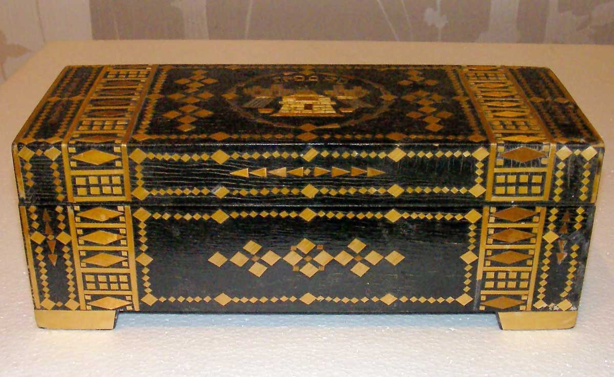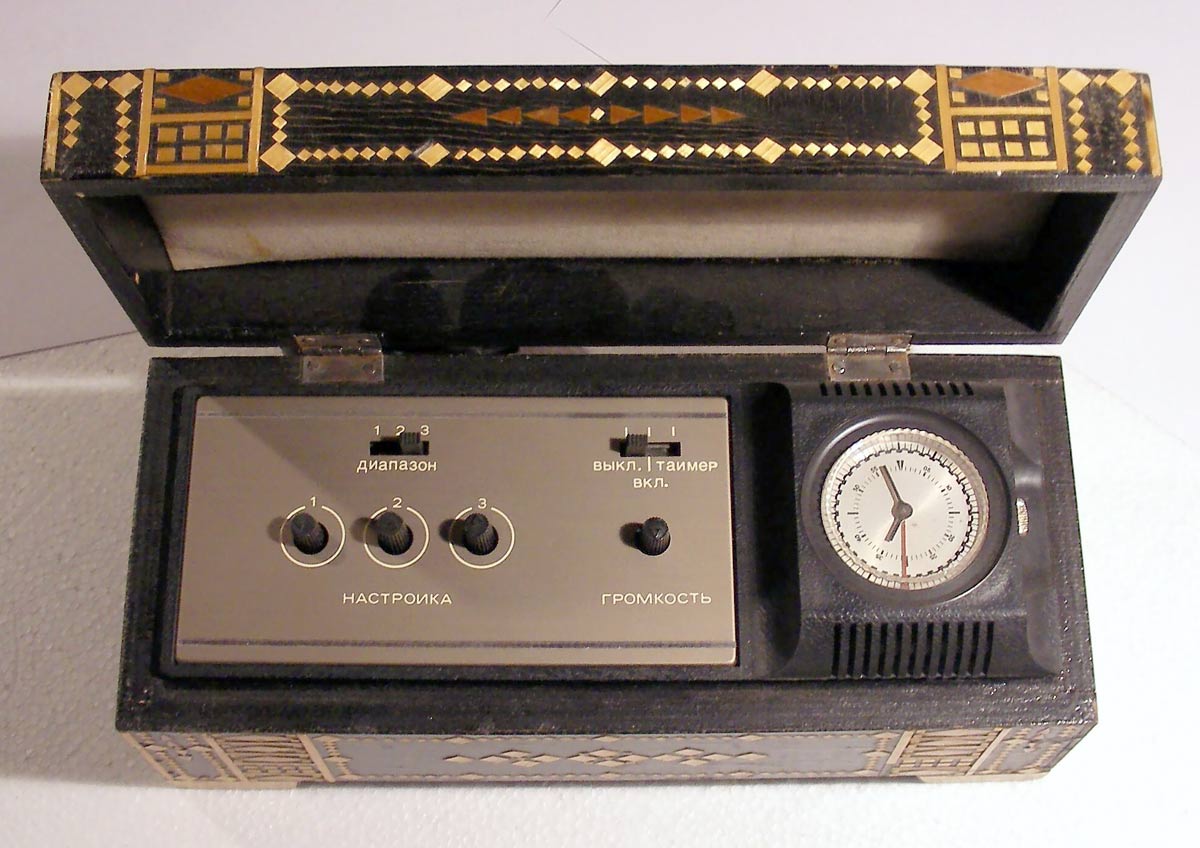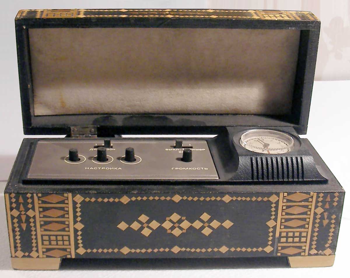 Стационарный транзисторный радиоприёмник *Шкатулка* с I-кв 1982 года выпускал Гродненский завод *Радиоприбор*. Сувенир **Шкатулка** с встроенным радиоприёмником прямого усиления работает в диапазоне ДВ и СВ. Приёмник позволяет беспоисково принимать три заранее настроенных радиостанции. Имеется таймер, работающий как часы и позволяющий в определённое время включать приёмник, используя его как будильник. Чувствительность в диапазоне ДВ - 5 мВ/м, СВ - 8 мВ/м. Селективность 15 дБ. Номинальная выходная мощность 180 мВт. Питание от 6-ти элементов типа А-316. Диапазон воспроизводимых частот 250...4000 Гц. Габариты сувенира 250х100х100 мм. Масса с батареями 900 гр. Шкатулка деревянная, фанерована, орнамент из соломки, лицевая панель из металла и пластика, часы - механические.