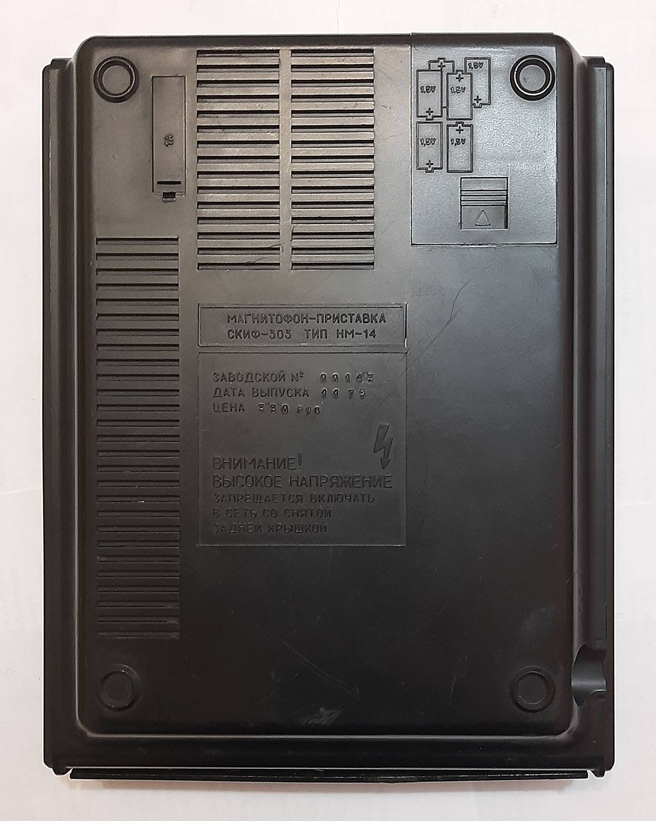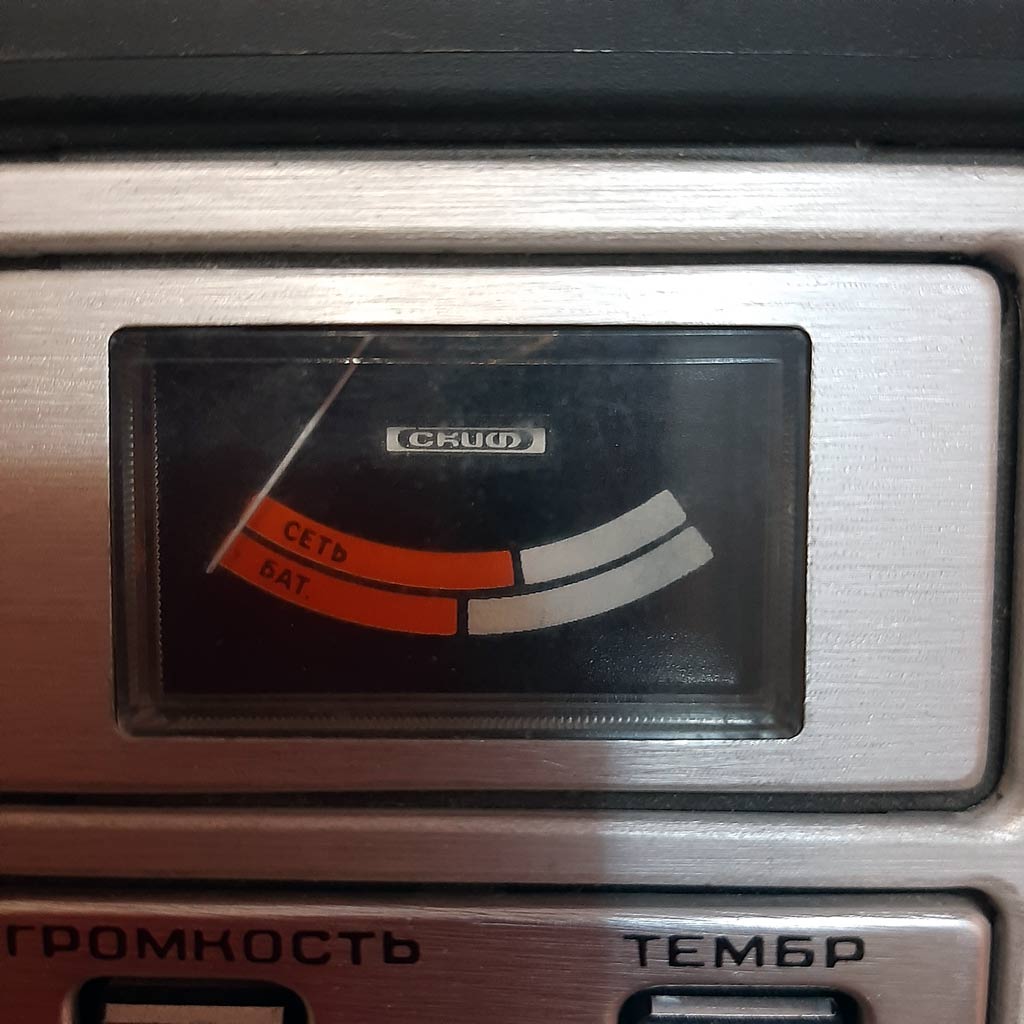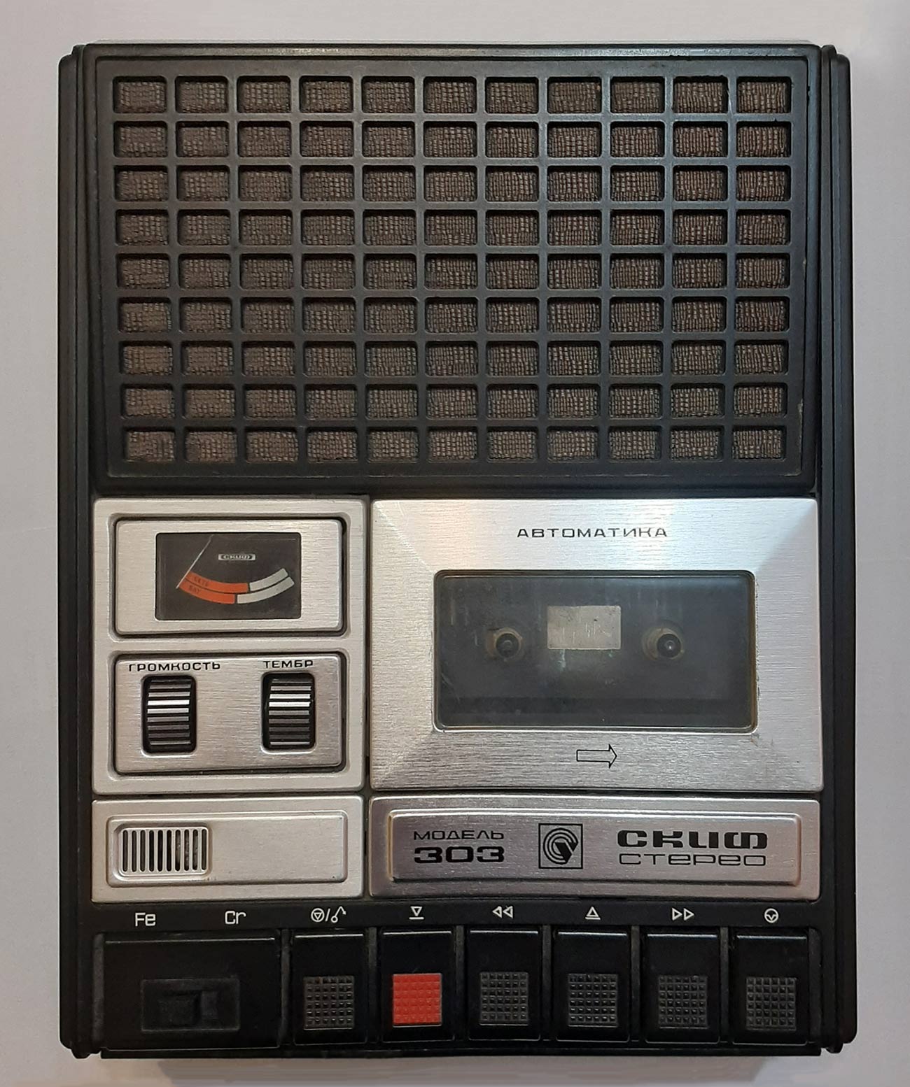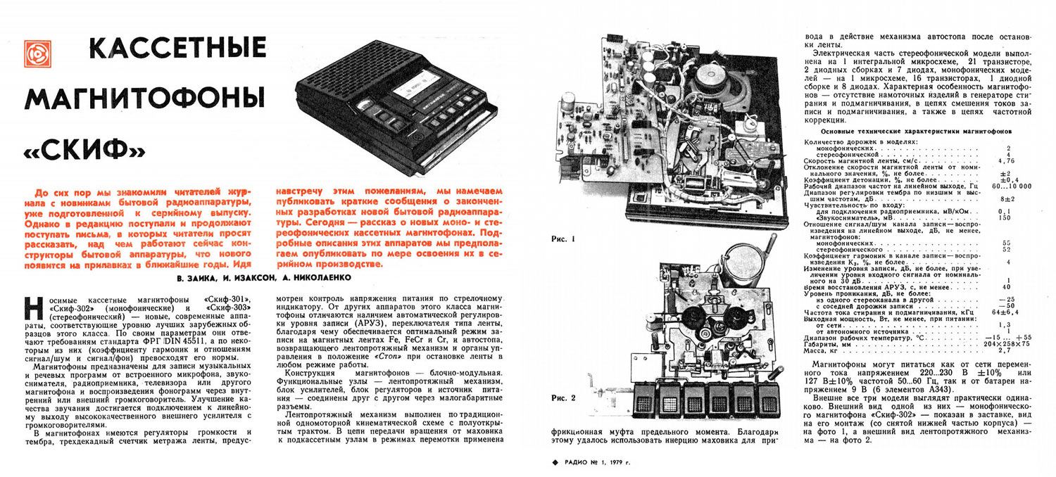 Кассетные магнитофоны *Скиф-301*, *Скиф-302* и *Скиф-303* в 1979 году подготовлены к выпуску Макеевским заводом *Скиф*. Магнитофоны предназначены для записи и воспроизведения фонограмм через внутреннюю и внешнюю АС. В моделях имеются регуляторы громкости и тембра, счетчик метража ленты, контроль питания по стрелочному индикатору. От других аппаратов такого же класса магнитофоны отличаются наличием АРУЗ, переключателя типа ленты, благодаря чему обеспечивается наилучший режим записи на лентах Fe, FeCr, Сr и автостопа, возвращающего ЛПМ в положение Стоп при остановке и обрыве ленты. Конструкция магнитофонов блочно-модульная. ЛПМ, блок усилителей, блок регуляторов и питания соединены разъёмами. ЛПМ магнитофонов выполнен по одномоторной кинематической схеме. В цепи передачи вращения от маховика к под-кассетным узлам при перемотке применена фрикционная муфта, благодаря чему используется инерция маховика для привода механизма автостопа. Магнитофон **Скиф-303** стереофонический аппарат. Его электрическая часть выполнена на интегральной микросхеме, 21 транзисторе, 2 диодных сборках и 7 диодах. Схема монофонических моделей выполнена на 1 микросхеме, 16 транзисторах, одной диодной сборке и 8 диодах. Особенность магнитофонов - полное отсутствие в схеме, за исключением блока питания моточных изделий. Все магнитофоны питаются от сети 127, 220 В или от 6 батарей А-343. Основные характеристики моделей: скорость протяжки магнитной ленты 4,76 см/с; коэффициент детонации ЛПМ - ±0,4%; рабочий диапазон звуковых частот на ЛВ - 60...10000 Гц; диапазон регулировки тембра НЧ и ВЧ - 8 дБ; номинальная выходная мощность при питании от сети 1,3 Вт; автономного источника 1 Вт. Габариты любого магнитофона - 204 х 258 х 75.Масса 2,7 кг. Магнитофоны серийно не выпускались, на другом, неустановленном заводе выпущена лишь опытная партия магнитофонов *Скиф-303*, но из-за огромной цены для 1979 года в 330 рублей магнитофон практически не покупался и его выпуск был прекращён.