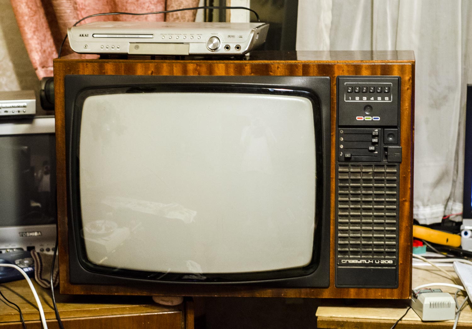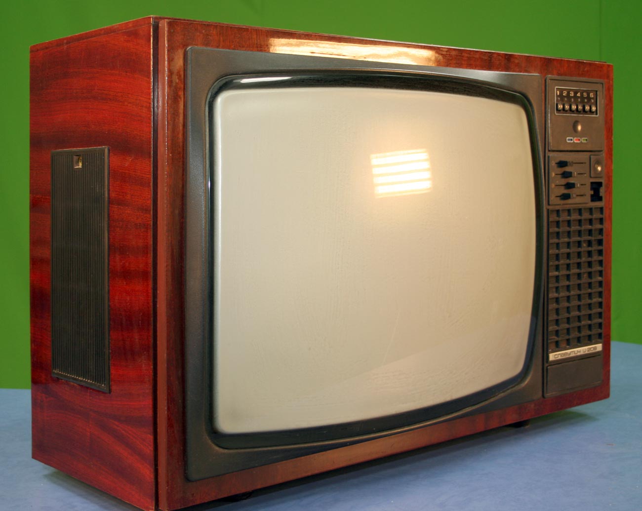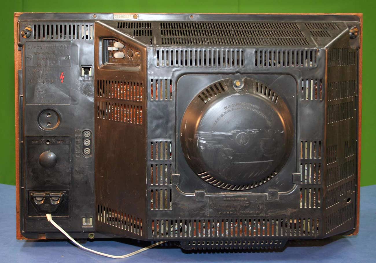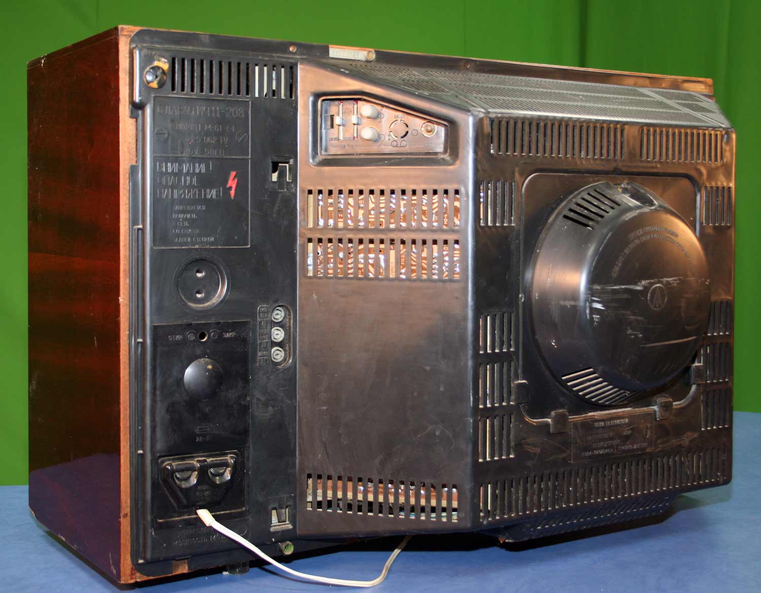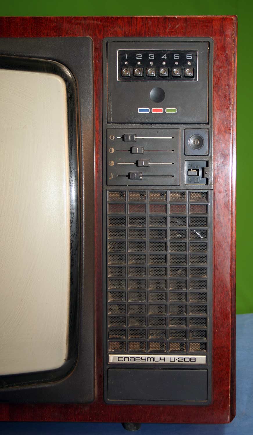 Телевизионный приёмник цветного изображения *Славутич Ц-208* с 1986 года выпускал Киевский радиозавод. Цветной полупроводниково-интегральный телевизор блочно-модульной конструкции УПИМЦТ-М-61-С-1 с кинескопом 61ЛК4Ц и углом отклонения лучей в 90° (наличие блока сведения). Сенсорное устройство выбора программ. Световая индикация для выбранной программы. Приём в диапазонах МВ и ДМВ. Гнёзда для подключения магнитофона, головных телефонов. Корпус облицован декоративной плёнкой или шпоном с лаковым покрытием. Потребляемая мощность 145 Вт. Габариты ТВ - 520x752,5x558 мм. Вес 43,5 кг. Цена 665 рублей. Подробнее в инструкции по эксплуатации.