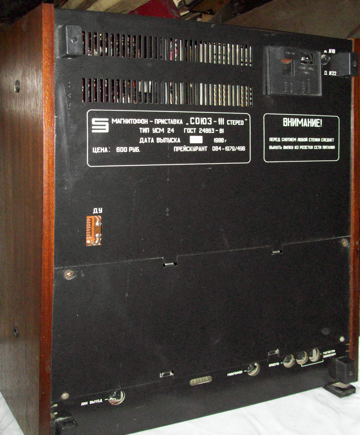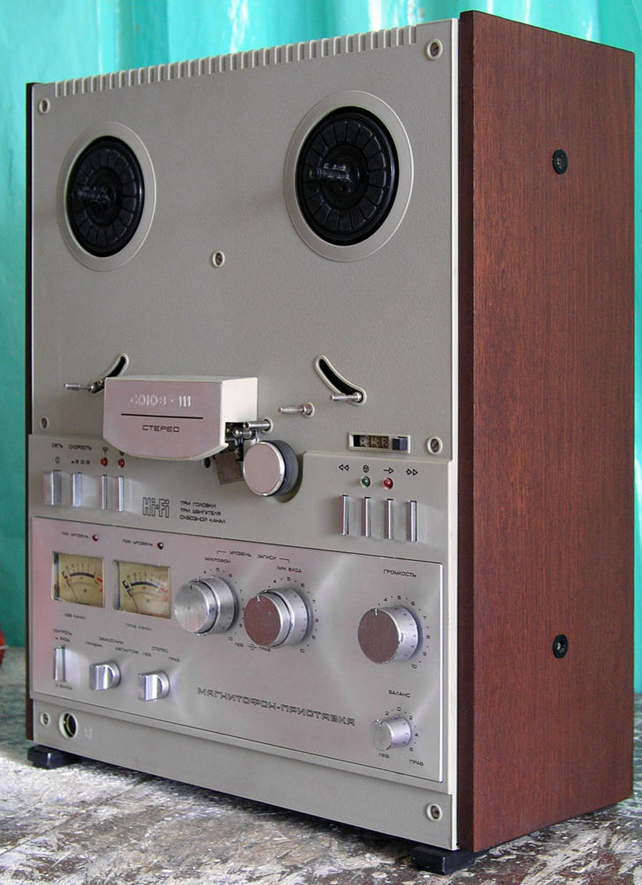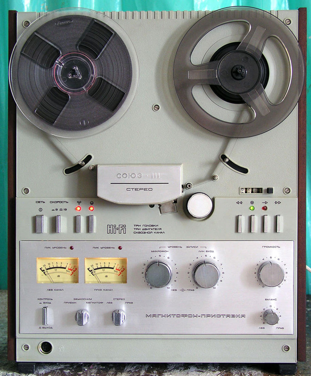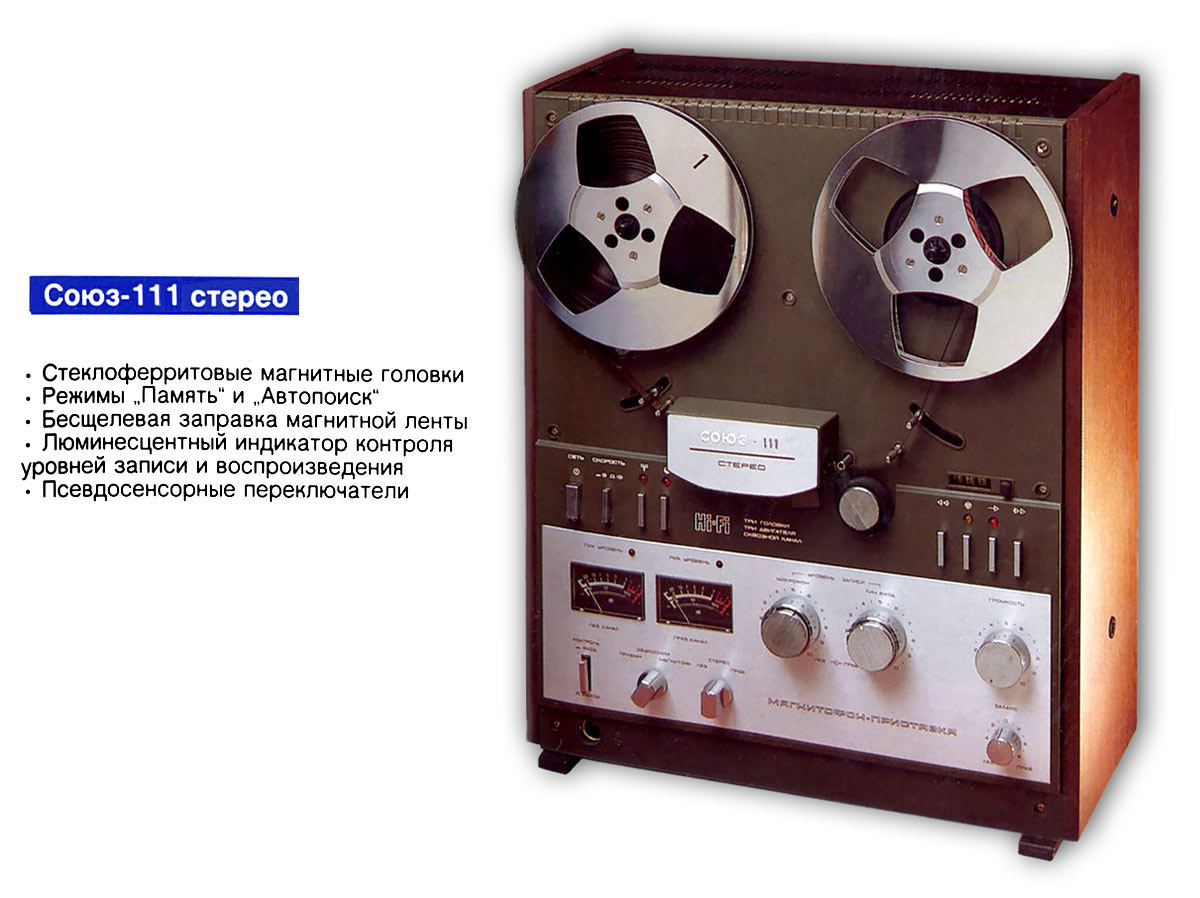 Стереофонический магнитофон-приставка *Союз-111-стерео* с 1987 года выпускалась Брянским ЭМЗ. МП обеспечивает запись магнитных фонограмм, с последующим воспроизведением через УКУ с АС и стереотелефонами. Применены: трёхмоторный ЛПМ с электронным управлением и автоматическим слежением за натяжением ленты при перемотке и на рабочем ходу; электронное торможение подкатушечных узлов. Имеется возможность: выполнения трюковых записей путем смешивания сигналов; автоматического останова при окончании и обрыве ленты; контроля уровня записи и воспроизведения по стрелочным индикаторам; перегрузки по пиковым индикаторам; индикации режимов; С помощью ПДУ *Эврика* (поставляемого отдельно) управление режимами работ и автоматического поиска нужной записи. Наличие раздельных магнитных головок даёт возможность слушать сигнал во время записи. Четырёх-декадный счётчик расхода ленты позволяет находить записи. В комплекте две катушки, одна с магнитной лентой. Тип ленты А4416-6Б. Номер катушки 18 или 22. Скорость ленты 19,05; 9,53 см/сек. Время записи 2х45; 2х90 мин. Диапазон частот 30...22000; 40...16000 Гц. Коэффициент детонации ±0,09; ±0,15%. КНИ на ЛВ - 1%. Уровень шумов и помех в канале З/В -63 дБ. Габариты МП - 510х420х234 мм. Масса - 20 кг. С осени 1990 года завод выпускал МП *Союз МПК-111С-1* по конструкции и оформлению практически аналогичную описанной.