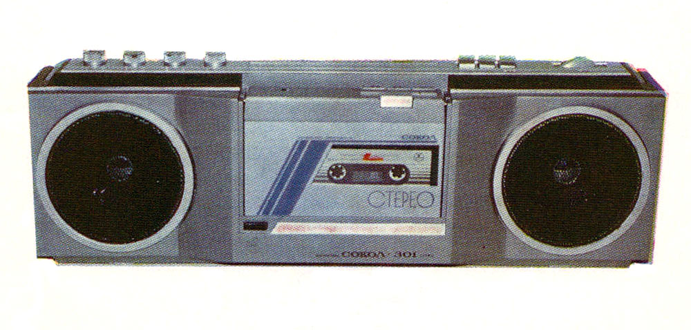 Портативная кассетная магнитола *Сокол-301-стерео* (Кенгуру) начала 1987 года выпускал Московский радиозавод. Стереофоническая переносная кассетная магнитола III группы сложности типа **Кенгуру** обеспечивает радиоприём в диапазонах ДВ, СВ и воспроизведение стерео и монофонических фонограмм. Она состоит из приёмника 3-го класса и магнитофона-проигрывателя, который может использовать как в составе магнитолы, так и отдельно. Магнитола имеет: внутреннюю магнитную антенну; переключатель типа ленты. Есть возможность: подключения внешней антенны, стереотелефонов и внешнего источника питания. Питается магнитола от сети переменного тока (через выносной БП) или от 6 элементов 343; магнитофона-проигрывателя (при индивидуальном использовании) от 2-х элементов 316. Корпус магнитолы и плейера из полистирола. Тип магнитной ленты А4205-3; А4212-ЗБ. Скорость ленты 4,76 см/с. Чувствительность модели в ДВ 2,5, СВ 1,5 мВ/м. Диапазон частот тракта АМ - 250...3550, магнитозаписи - 63...12500 Гц. Коэффициент детонации 0,4%. Максимальная выходная мощность 2х0,7 Вт. Габариты магнитолы 150х455х105 мм. Масса 3 кг, МП 90х150х36 мм, масса 450 г. Цена комплекта 170 рублей.