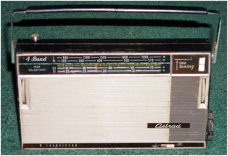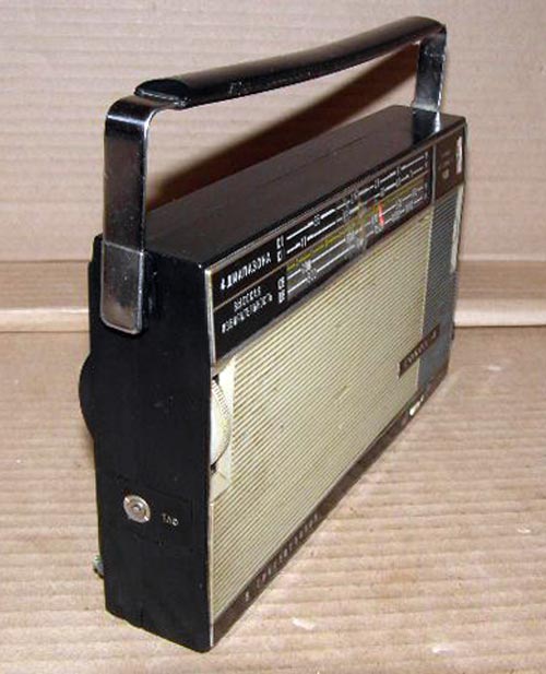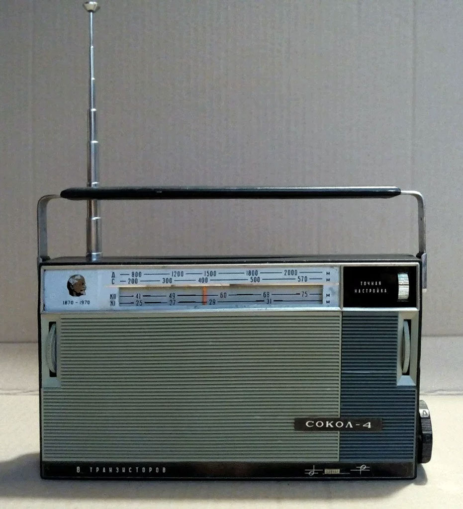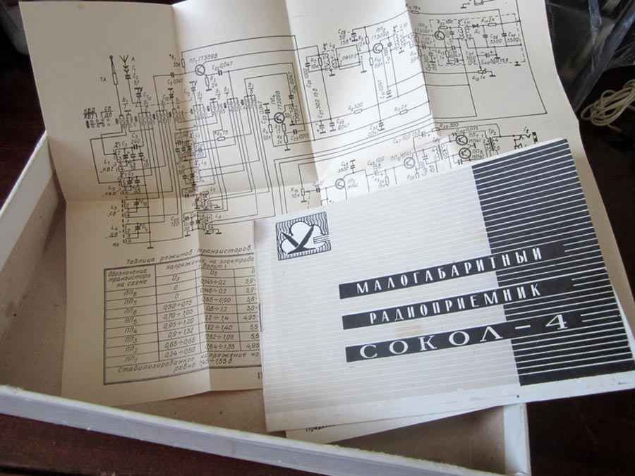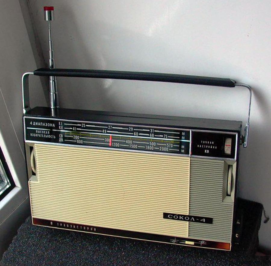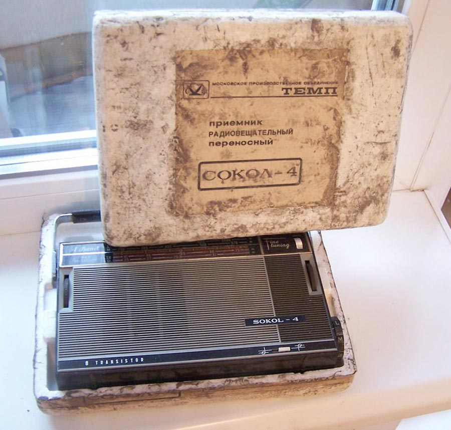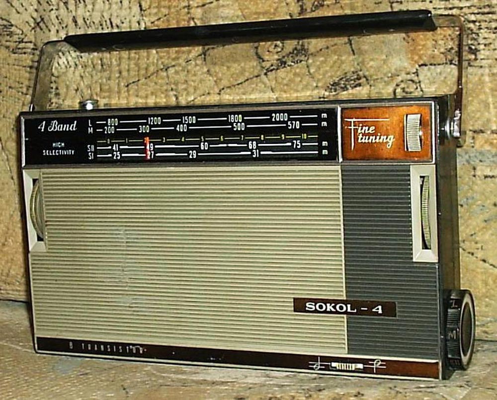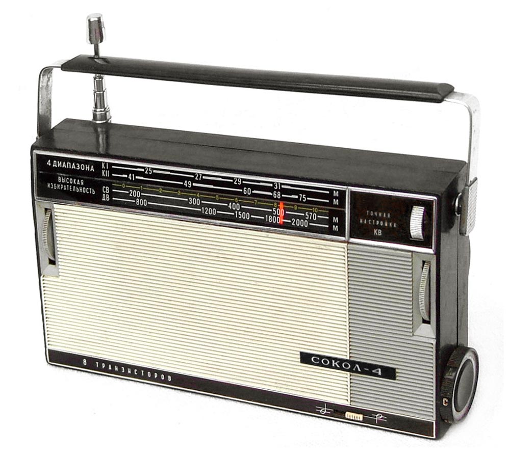 Транзисторный радиоприёмник *Сокол-4* с 1967 года выпускал Московский радиозавод. Приёмник представляет собой супергетеродин, собранный на восьми транзисторах и двух диодах. Он предназначен для приёма радиостанций в диапазонах ДВ, СВ и КВ. Приём в ДВ, СВ осуществляется на магнитную антенну, а в КВ на телескопическую. К приёмнику можно подключить головной телефон. Питание приёмника осуществляется от четырёх элементов А-316. Управление с помощью четырёх ручек; настройки, подстройки, переключателя диапазонов и регулятора громкости с выключателем питания. Диапазоны: ДВ - 735...2000, СВ - 186...570 и КВ - 25...75 метров. КВ диапазон разбит на два поддиапазона: KВ-1 - 25...31 м и КВ-2 - 41...75 м. Экспортные варианты имели как указанные, так и другие частоты КВ поддиапазонов. Чувствительность модели 1,8 мВ/м на ДВ, 0,8 мВ/м на СВ, 150 мкВ на КВ. Селективность 46 дБ. Номинальная выходная мощность 100 мВт. Ток покоя 10 мА. Габариты радиоприёмника 215 х 125 х 47 мм. Масса с элементами питания 950 грамм.
