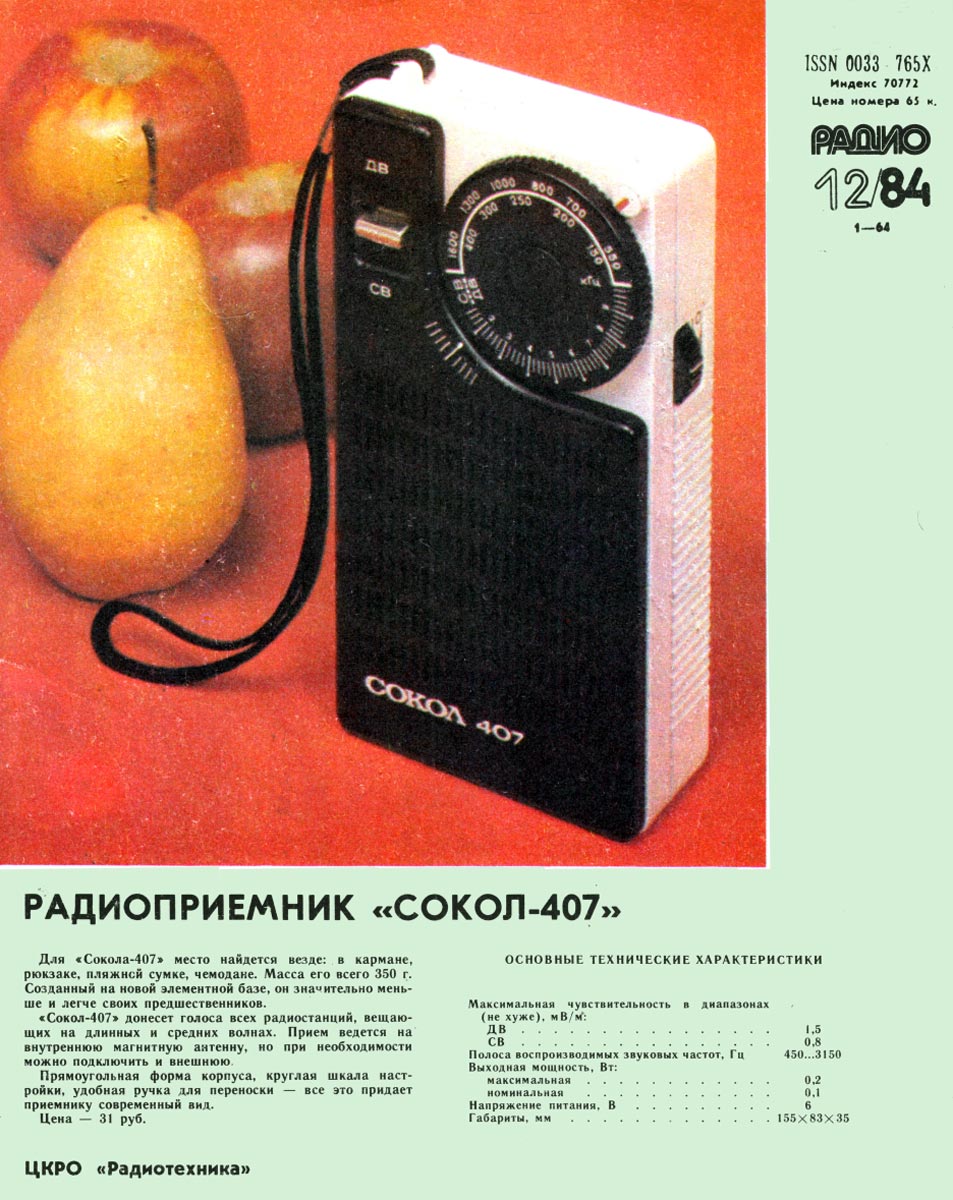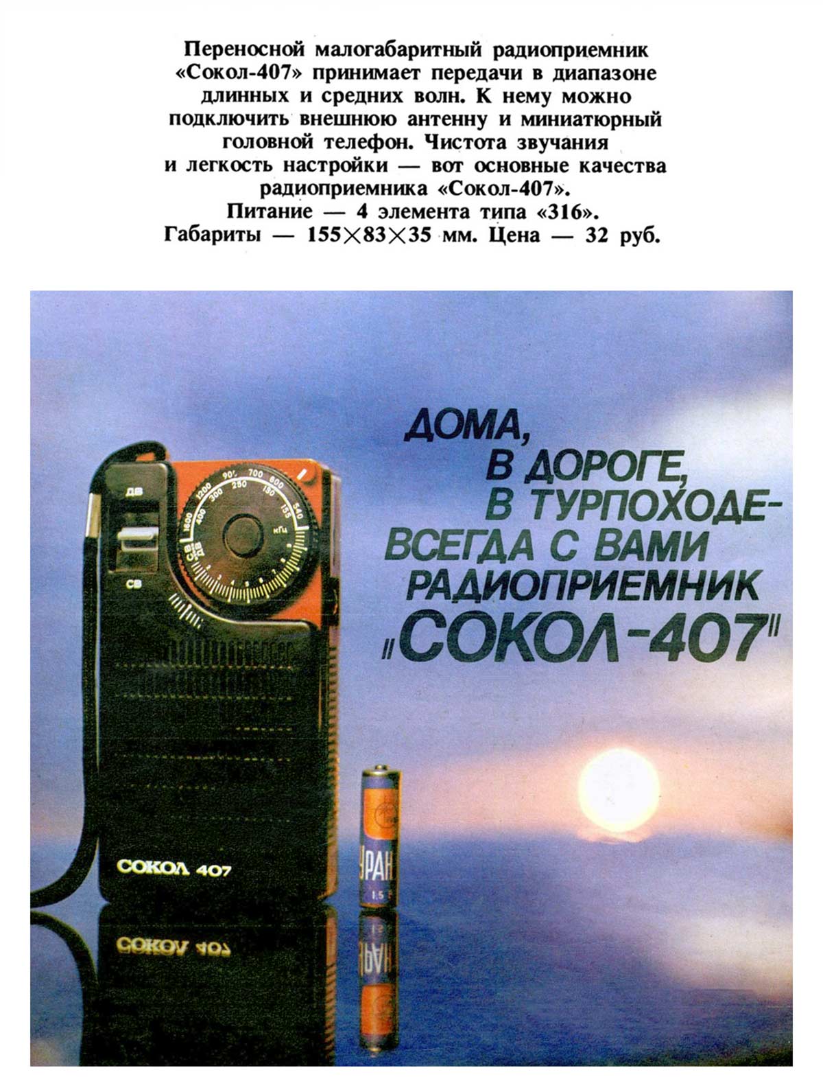 Портативный радиоприёмник *Сокол-407* с 1984 года выпускал Московский радиозавод. Радиоприёмник разработан на базе модели **Сокол-404** и отличается от него оформлением, меньшей массой, размерами и новой элементной базой. Питается приёмник 4-х элементов 316. Радиоприёмник работает в диапазонах длинных и средних волн. Приём осуществляется на магнитную антенну, но при необходимости можно подключить и внешнюю. Прямоугольная форма корпуса, круглая, хорошо читаемая шкала, удобная ручка для переноски придают приёмнику современный вид. Чувствительность в диапазонах ДВ - 1,5, СВ - 0,8 мВ/м. Диапазон частот звука 450...3150 Гц. Номинальная выходная мощность 0,1, максимальная 0,2 Вт. Габариты модели 155х83х35 мм. Вес 350 гр. Цена 31 рубль.