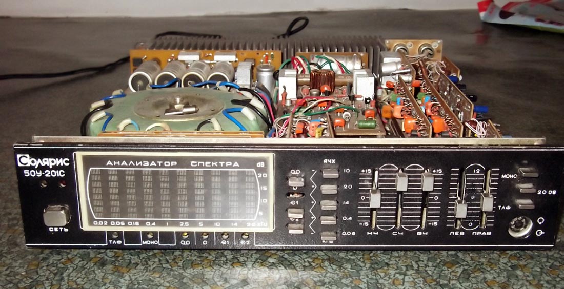Усилитель звуковой частоты *Солярис 50У-201С* (он же *Солярис У-001С) выпускался с 1990 года Пензенским ПО *Электроприбор*. Предназначен для высококачественного усиления стереофонических сигналов с любых источников. Технические характеристики: Номинальная выходная мощность 2х50 Вт. Номинальный диапазон частот - 20...20000 Гц. Сопротивление нагрузки 4 Ом. КНИ не более 0,7%. Номинальная чувствительность 0,5 В. Габариты усилителя 385х320х75 мм. Масса 9 кг. Розничная цена 1500 рублей.